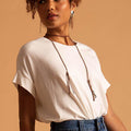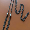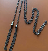 Colar tipo gravata em latão, banho grafite, comprimento total 1,20 m com os pingentes.