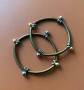 Duo de pulseiras em latão banho ouro velho montadas em fio de silicone elástico, pingentes bolinha prata e ouro.