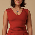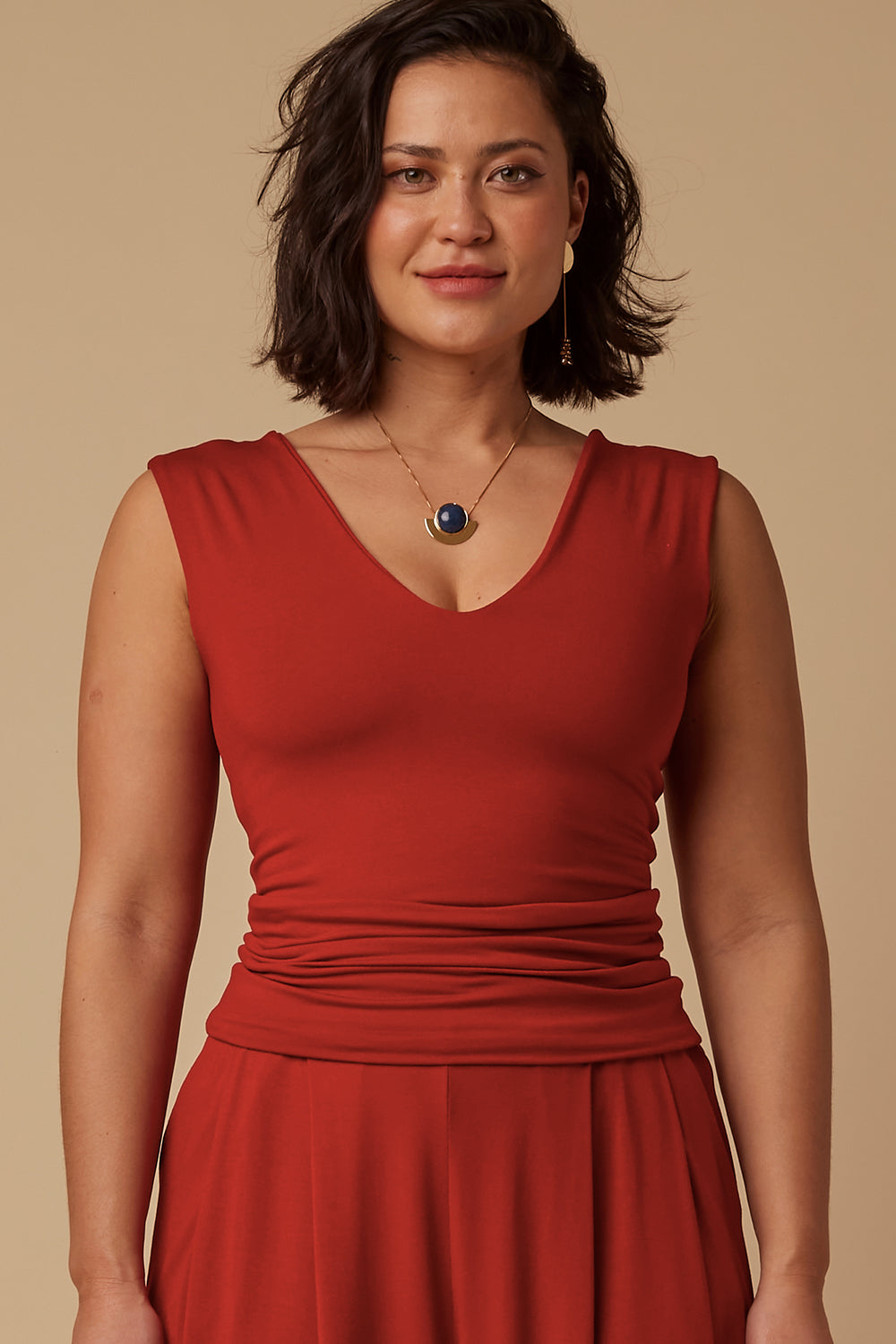 Blusa com decote U na frente e nas costas, com camada tripla na frente. A básica perfeita.