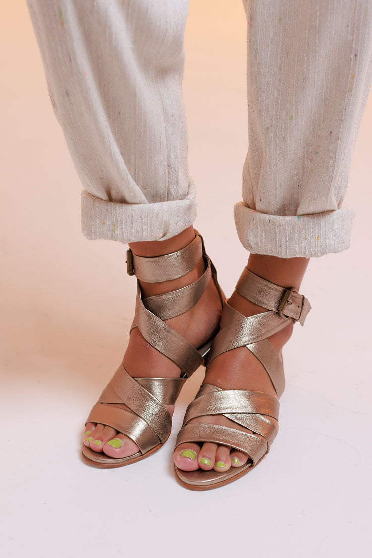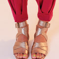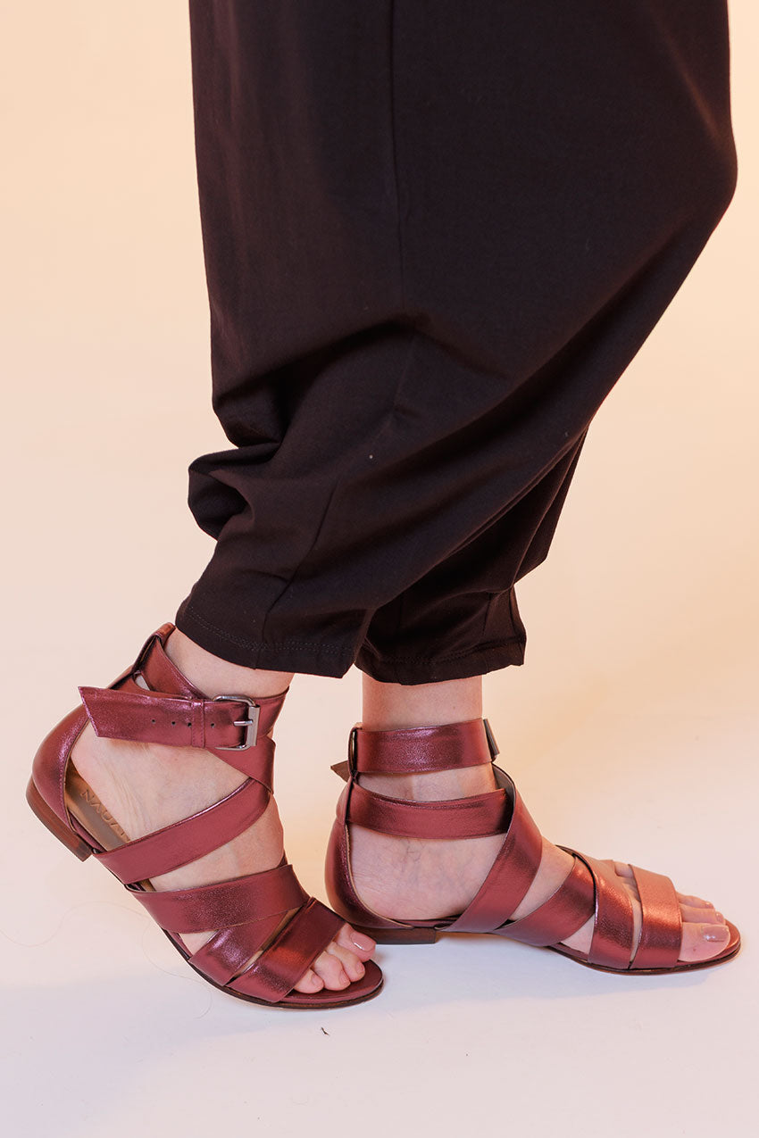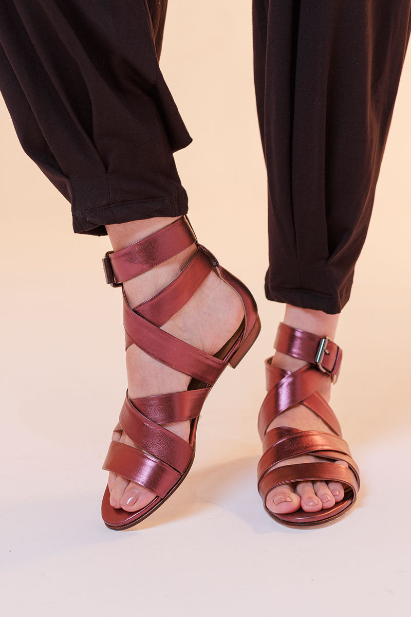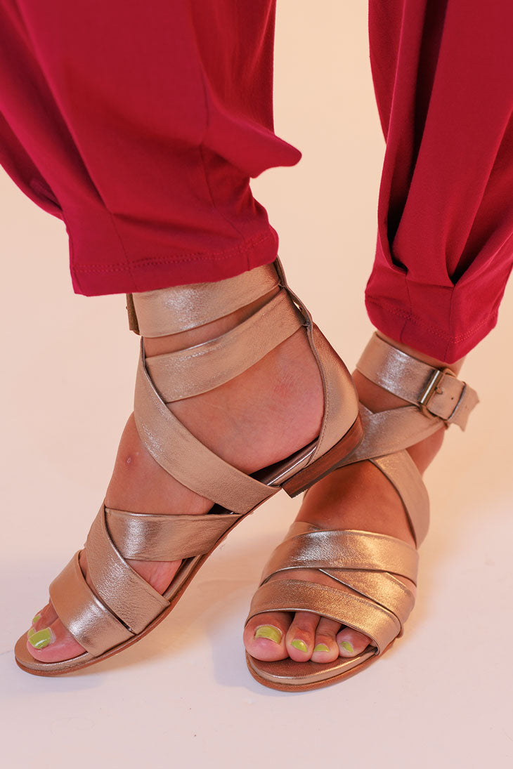 Sandália rasteira, feita em couro de cabra verdadeiro, com acabamento e aspecto metalizado ou lisa. Possui tiras largas e reguláveis no peito do pé e tornozelo, fechada no calcanhar e com fechamento por fivela. Toda forrada em pelica, ultra macia e confortável. Nossa versão leve, chic e moderna da gladiadora. Proporciona no look o peso ideal nos pés, para ser usada tanto no verão quanto no inverno.