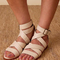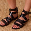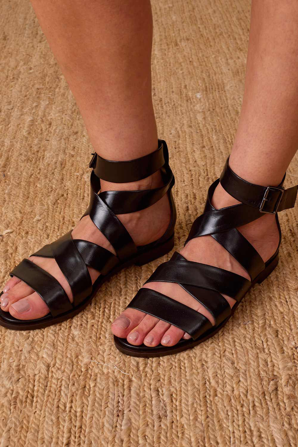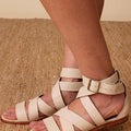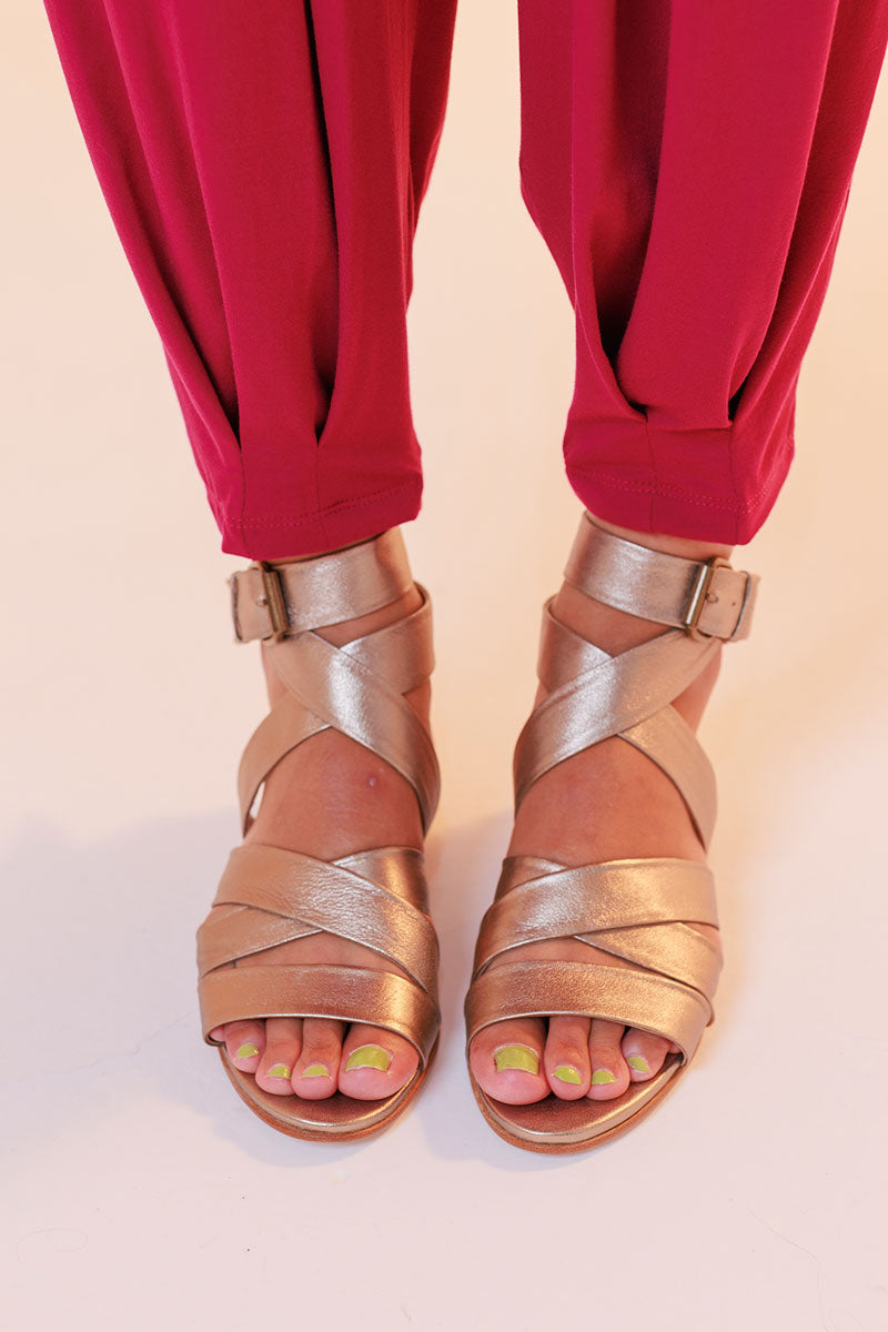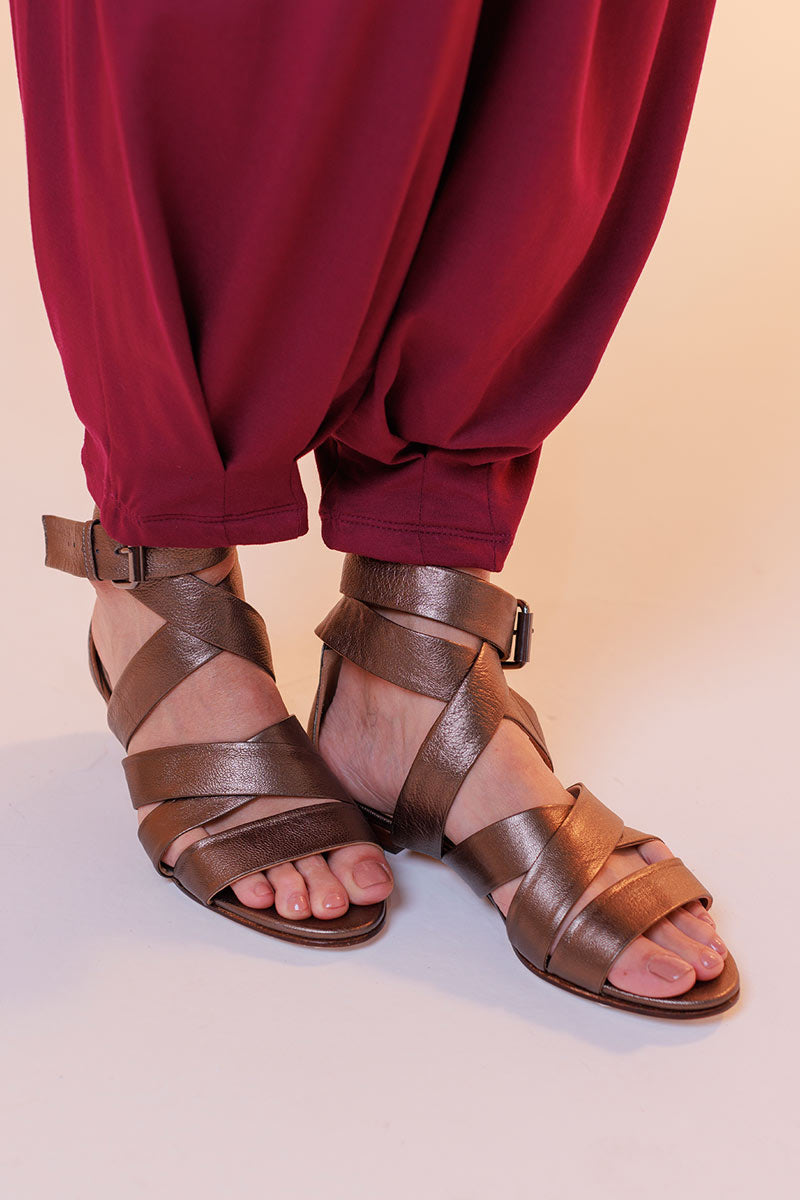 Sandália rasteira, feita em couro de cabra verdadeiro, com acabamento e aspecto metalizado ou lisa. Possui tiras largas e reguláveis no peito do pé e tornozelo, fechada no calcanhar e com fechamento por fivela. Toda forrada em pelica, ultra macia e confortável. Nossa versão leve, chic e moderna da gladiadora. Proporciona no look o peso ideal nos pés, para ser usada tanto no verão quanto no inverno.