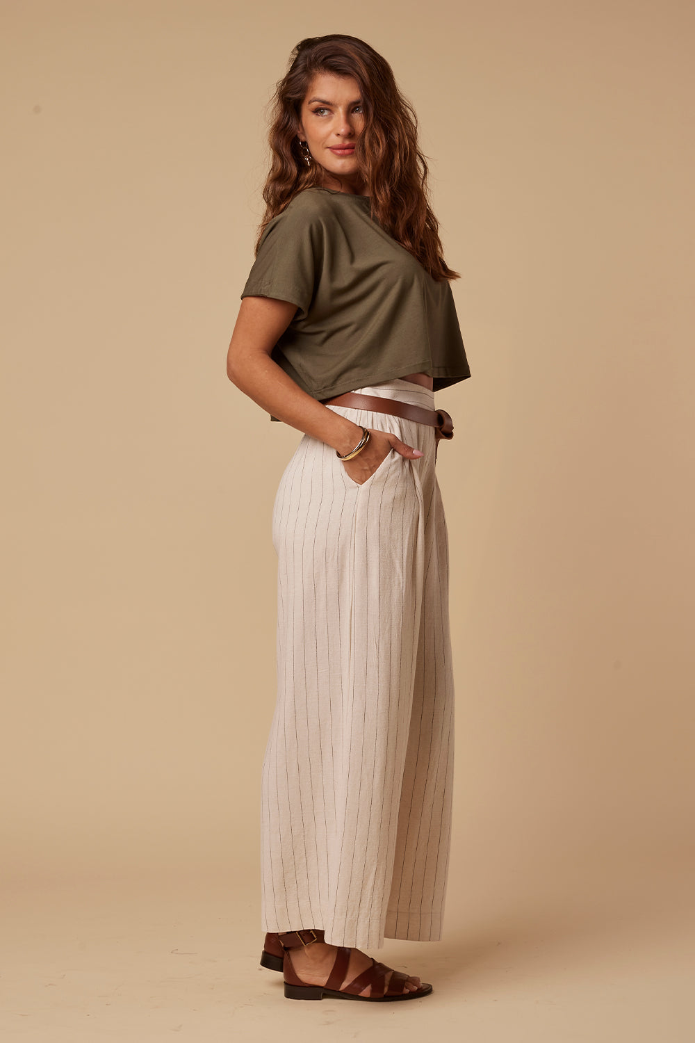Calça com modelagem pantalona de comprimento midi, com elástico na cintura e bolsos nas costuras laterais.