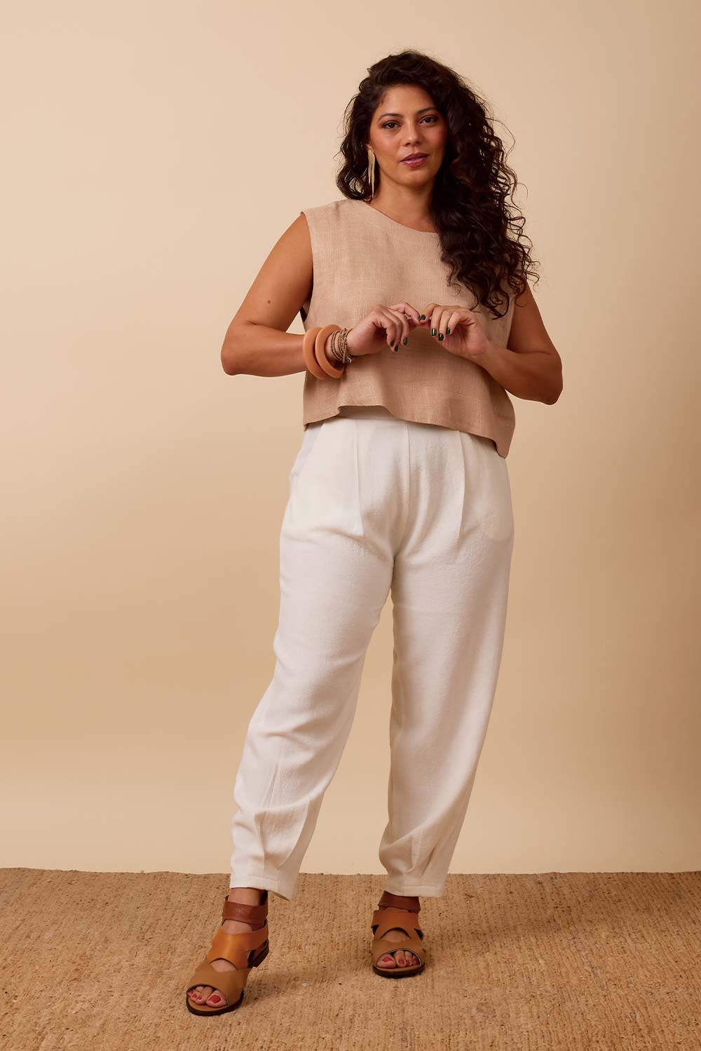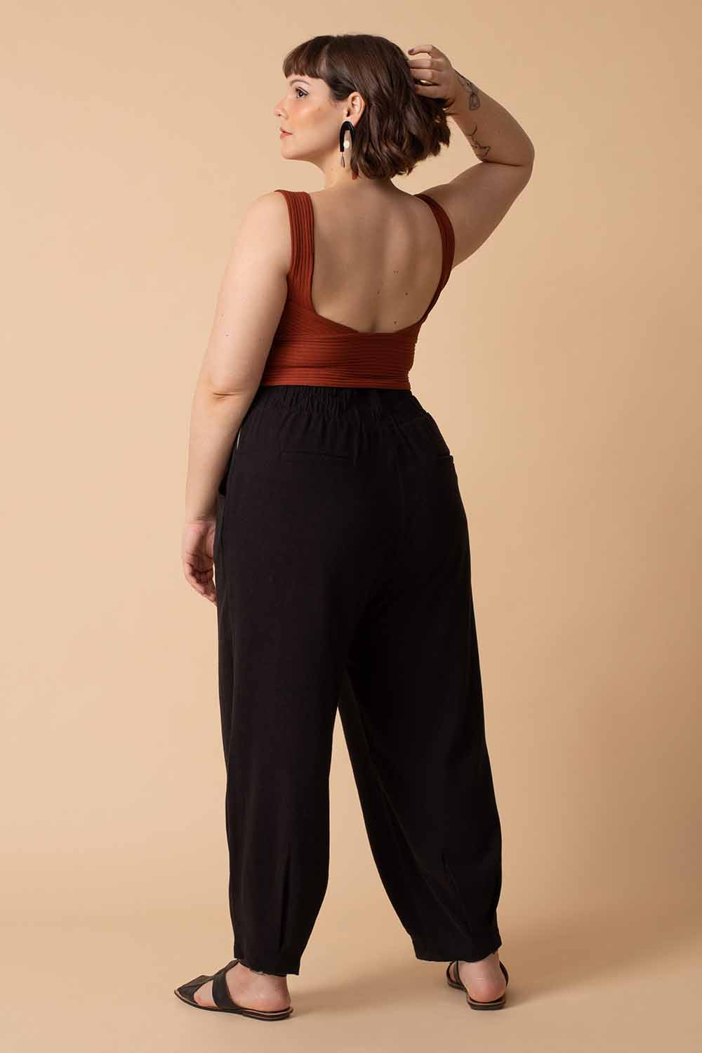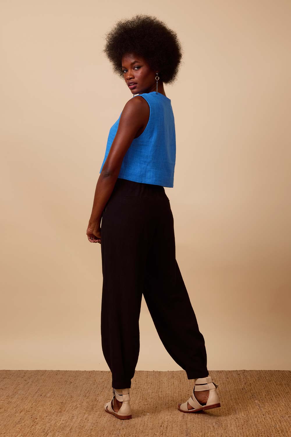 Calça em modelagem estilo "aladim", em tecido de viscose com linho, com construção rústica de aspecto natural. Possui uma pala larga na cintura e pernas que afunilam em pregas. Possui bolsos faca e elástico na parte de trás do cós, além de ziper lateral de metal.