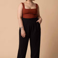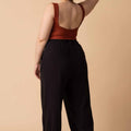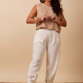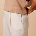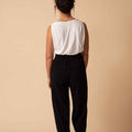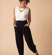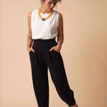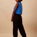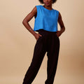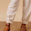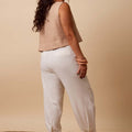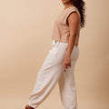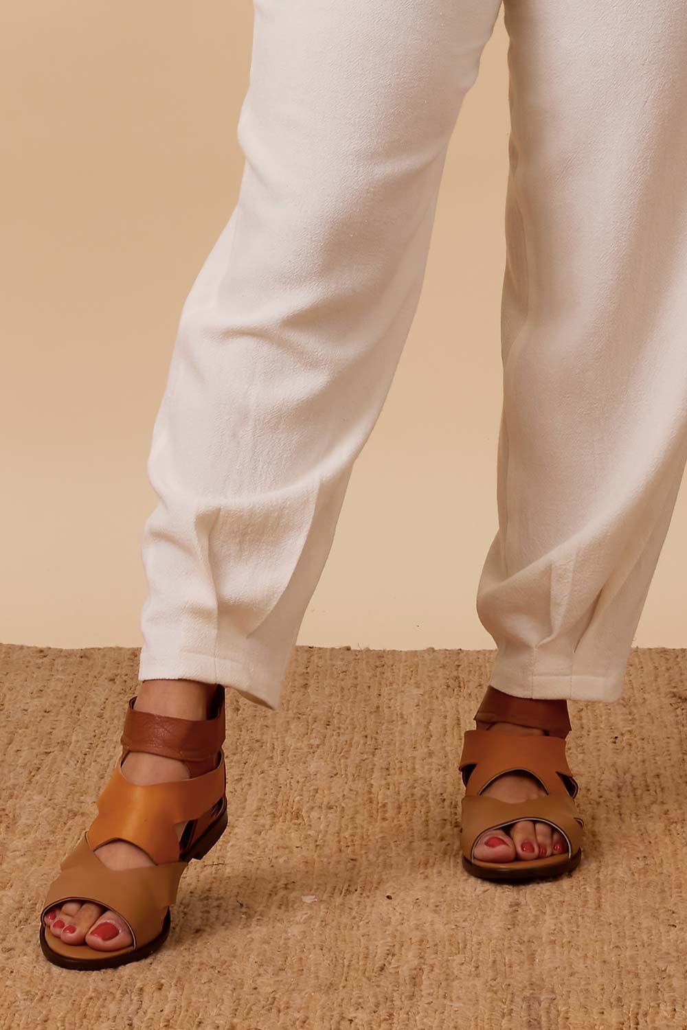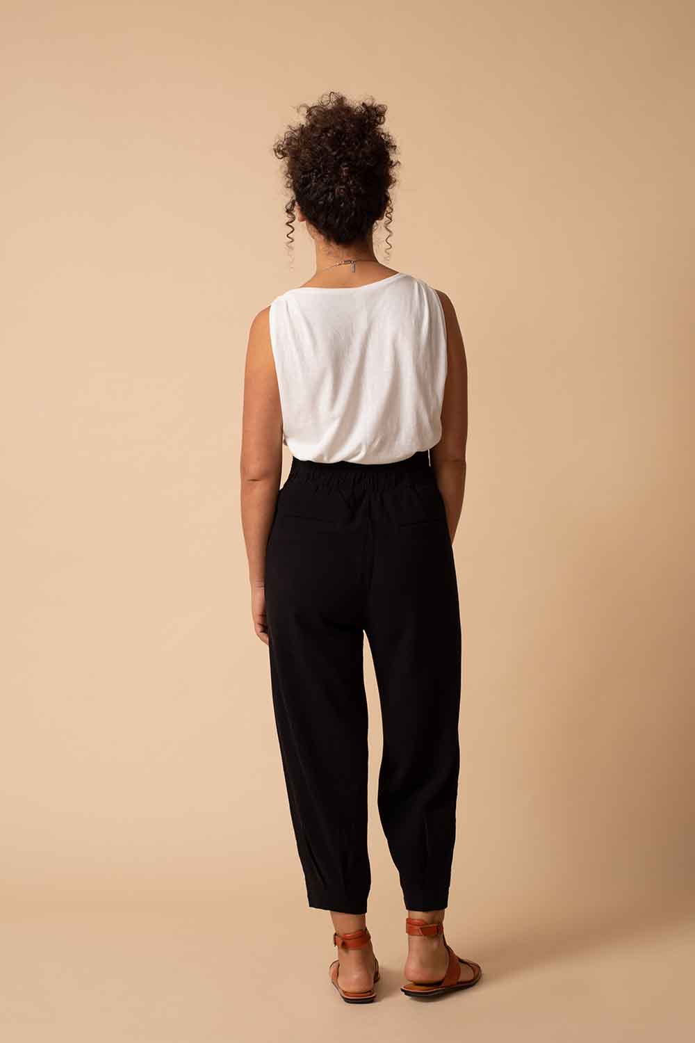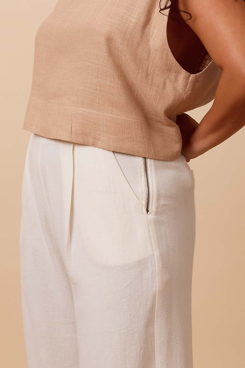 Calça em modelagem estilo "aladim", em tecido de viscose com linho, com construção rústica de aspecto natural. Possui uma pala larga na cintura e pernas que afunilam em pregas. Possui bolsos faca e elástico na parte de trás do cós, além de ziper lateral de metal.