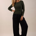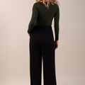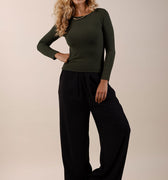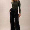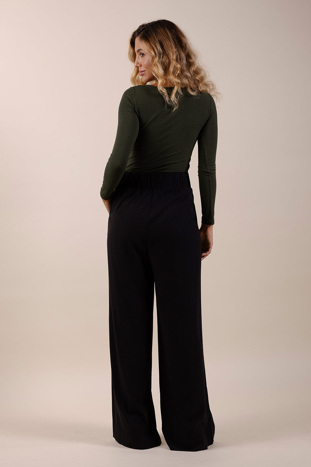 Calça com modelagem pantalona clássica, sem muito volume. Possui bolsos somente na frente, ziper lateral e com cós com elástico atrás para maior conforto e vestilbilidade.