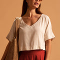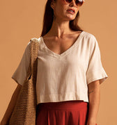 Blusa estilo bata, com modelagem quadrada e soltona, com mangas amplas, e decote V generoso e comprimento certinho para cair por fora dos cós de nossas partes de baixo.