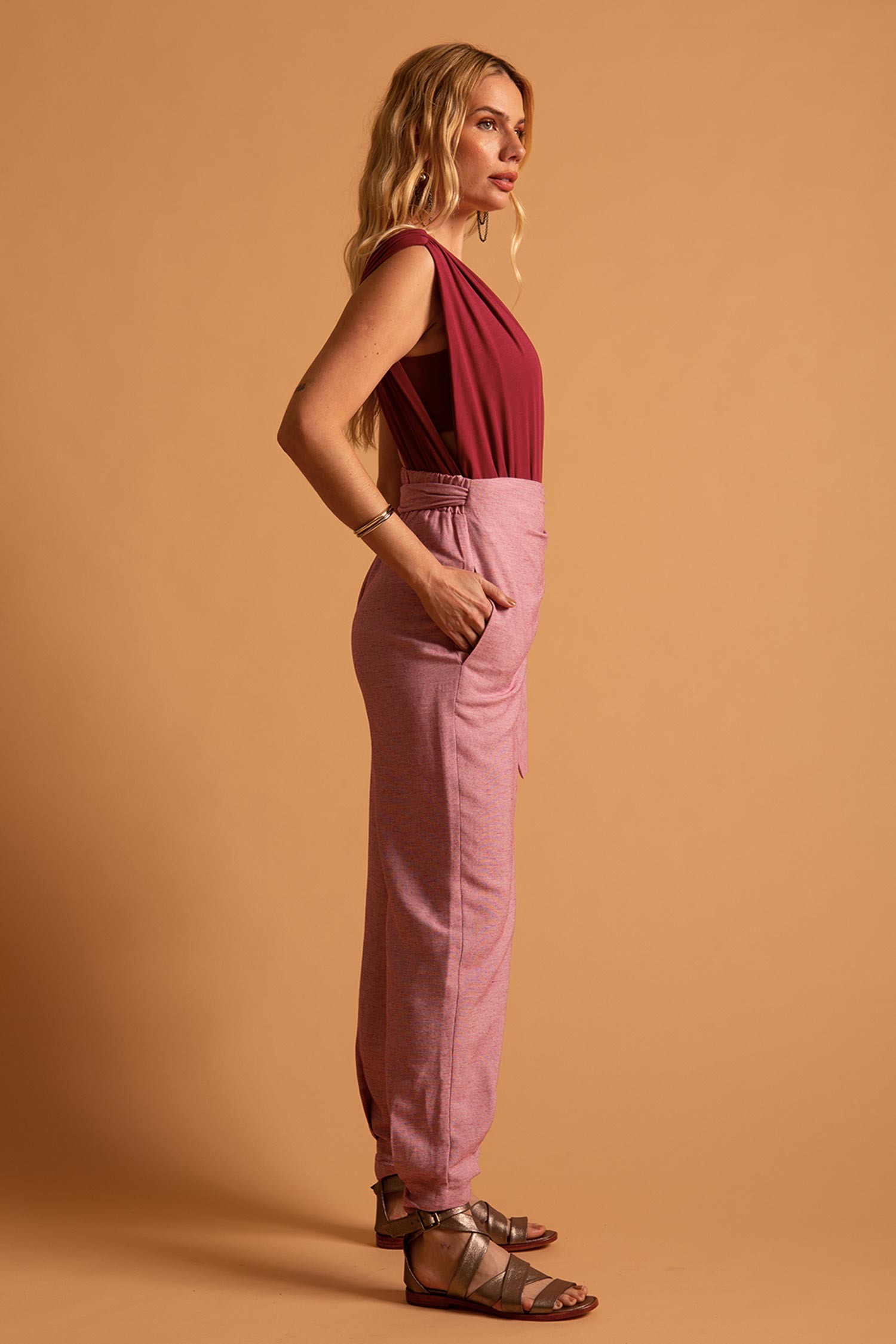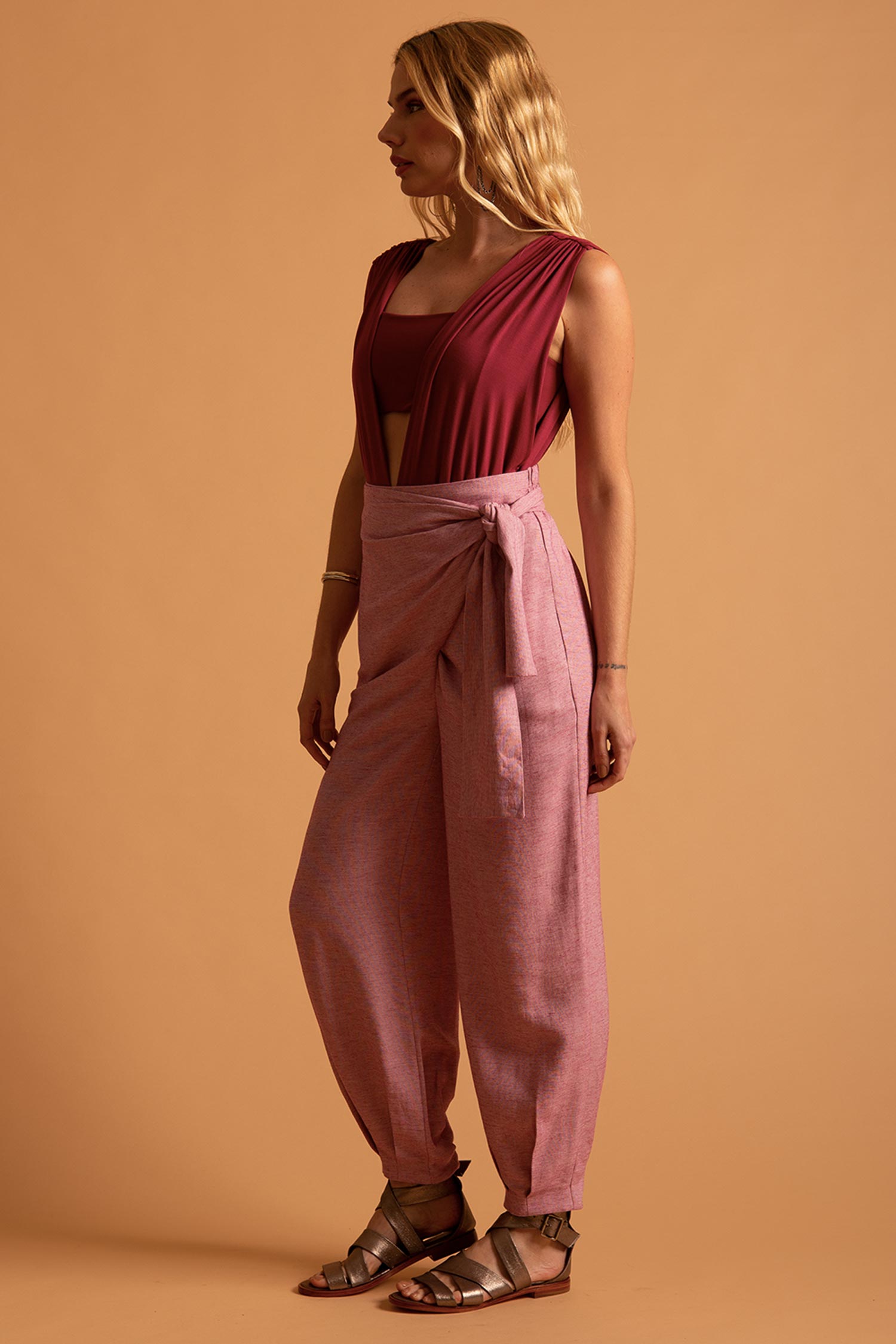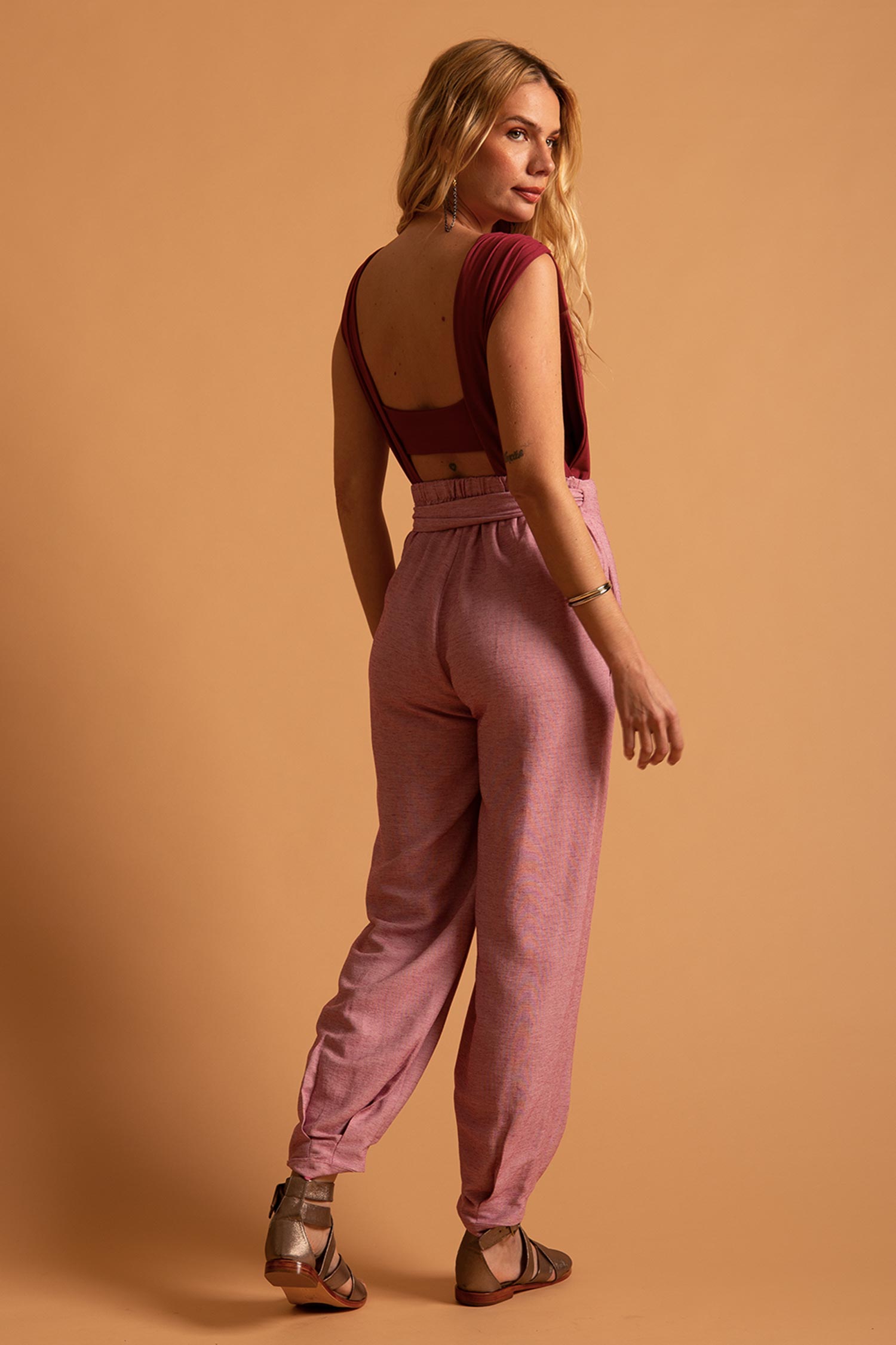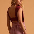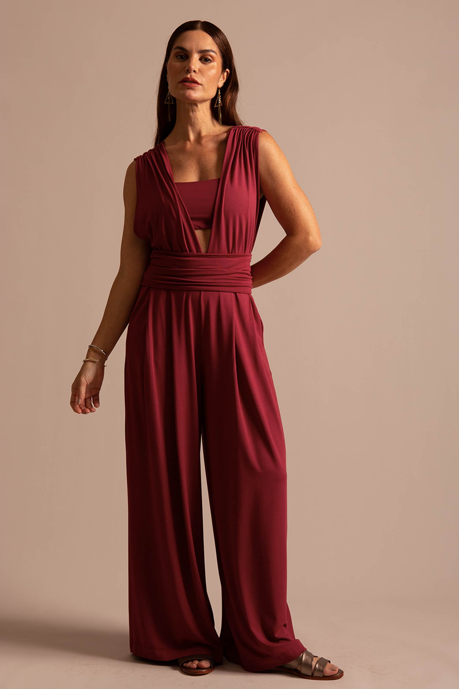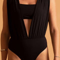 Nosso novo xodó, criamos uma versão mais ousada do Body Vênus. Esse body tem decote V profundo até a cintura, todo drapeado, e acompanha top pra ser usado por baixo dele, criando desenhos geométricos e recortes na pele.