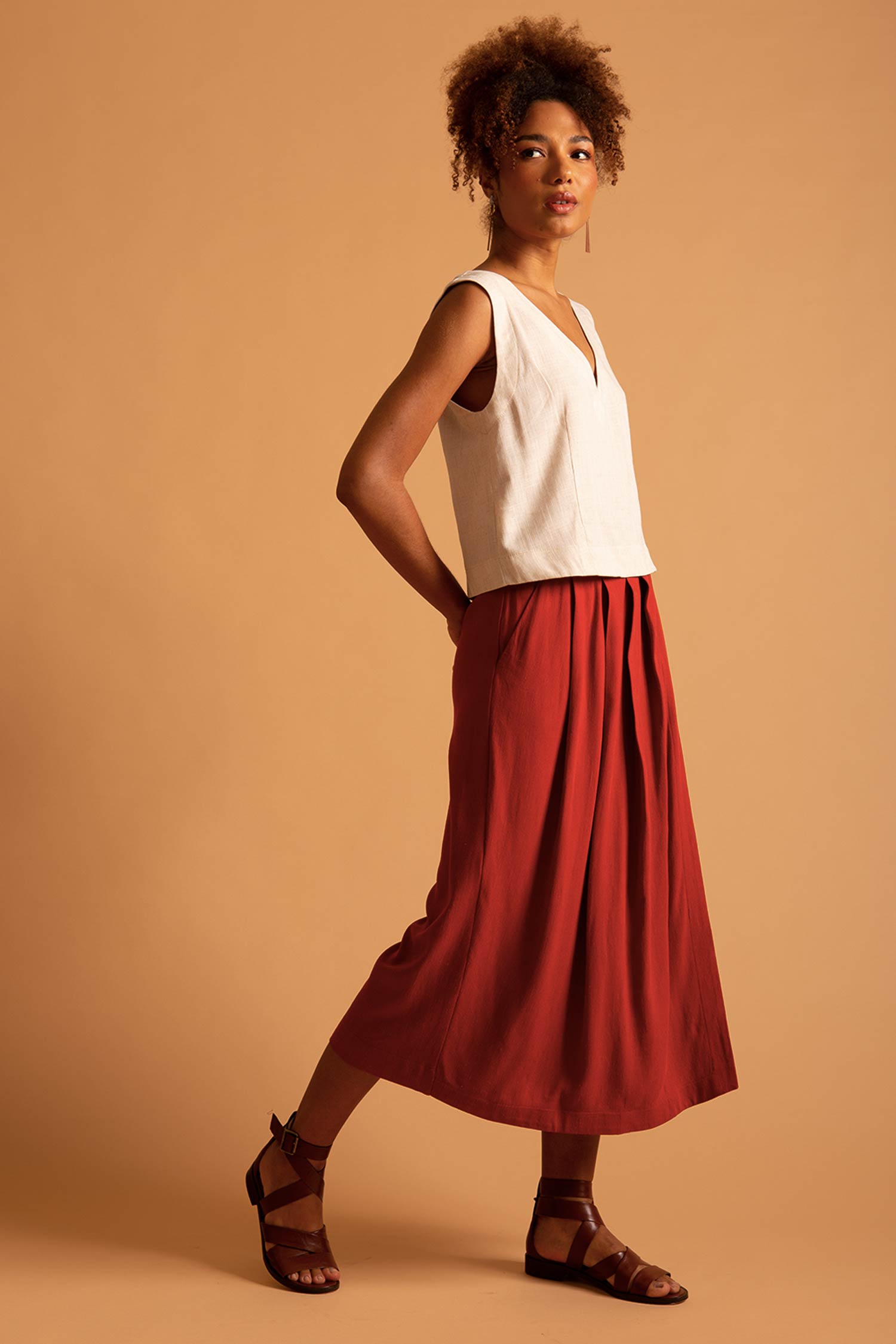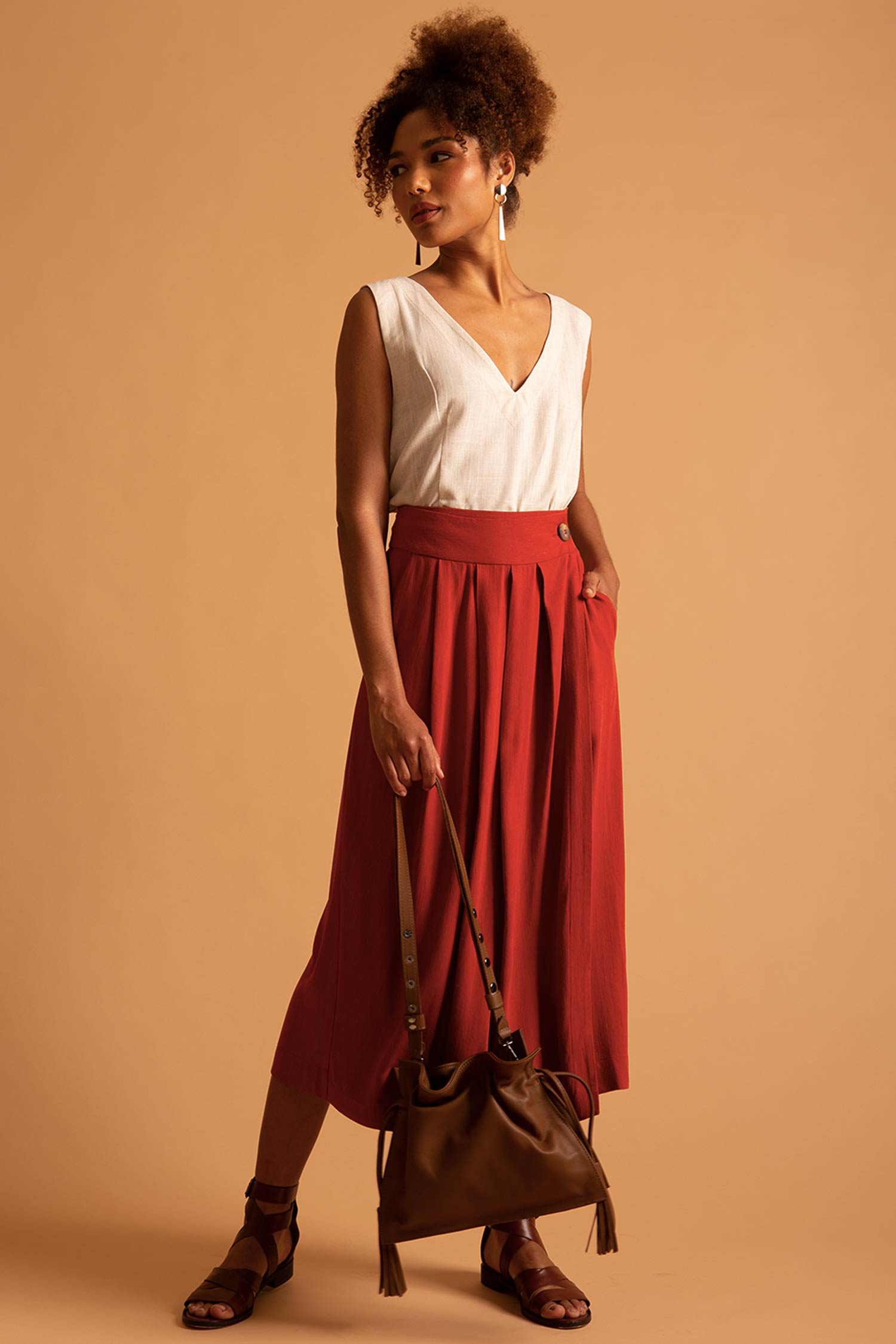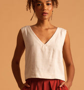 A Blusa Bruna feita em linho e viscose, oferece leveza e conforto.