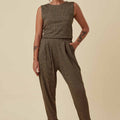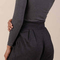 Possui elástico na cintura, pregas, bolso faca e barra dupla pra ser dobrada.