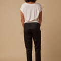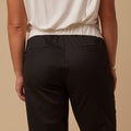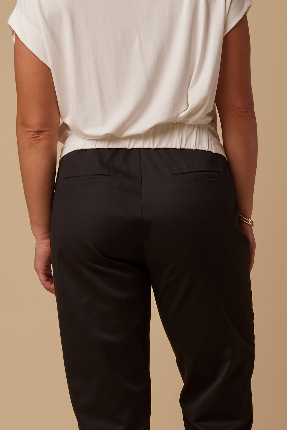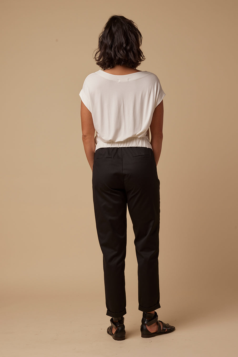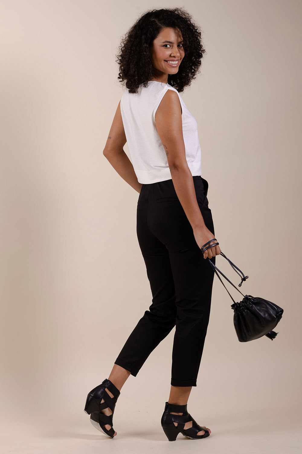 Calça de modelagem sequinha, estilo "capri" mais curtinha, feito em tecido encorpado de algodão, com cós com elástico atrás somente para conforto e detalhe de barra italiana.