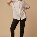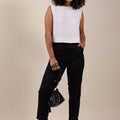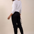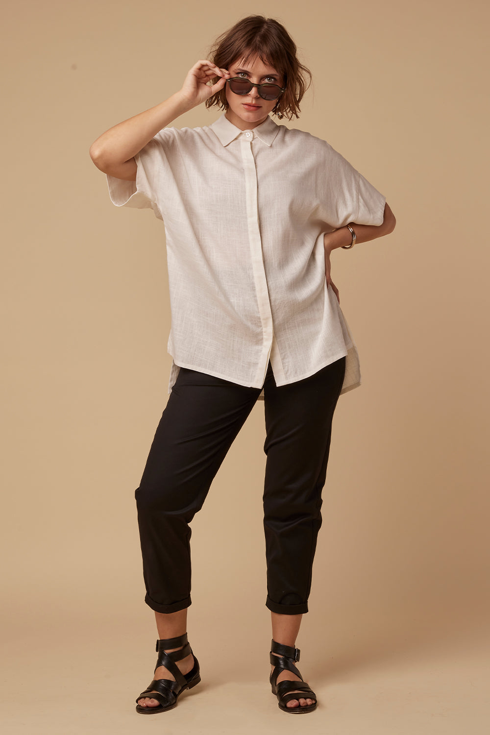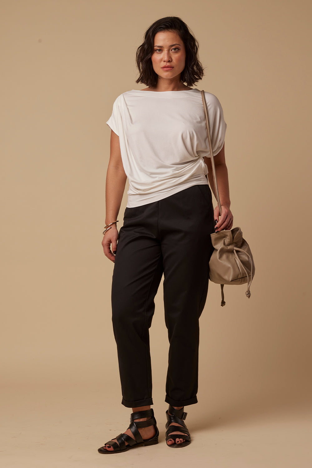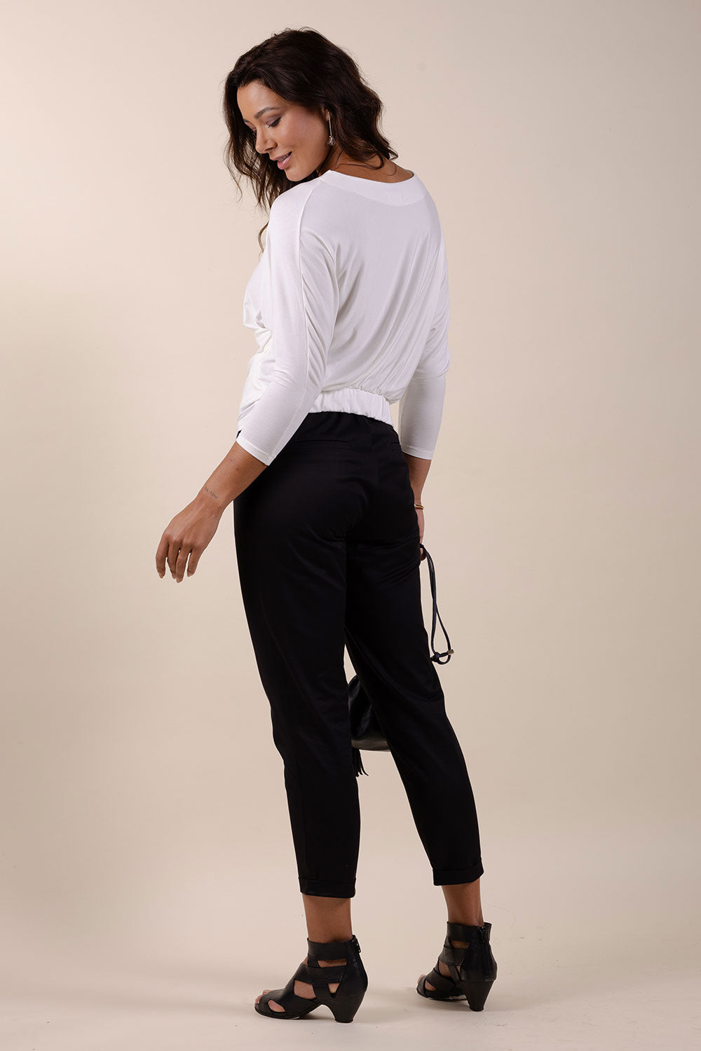 Calça de modelagem sequinha, estilo "capri" mais curtinha, feito em tecido encorpado de algodão, com cós com elástico atrás somente para conforto e detalhe de barra italiana.