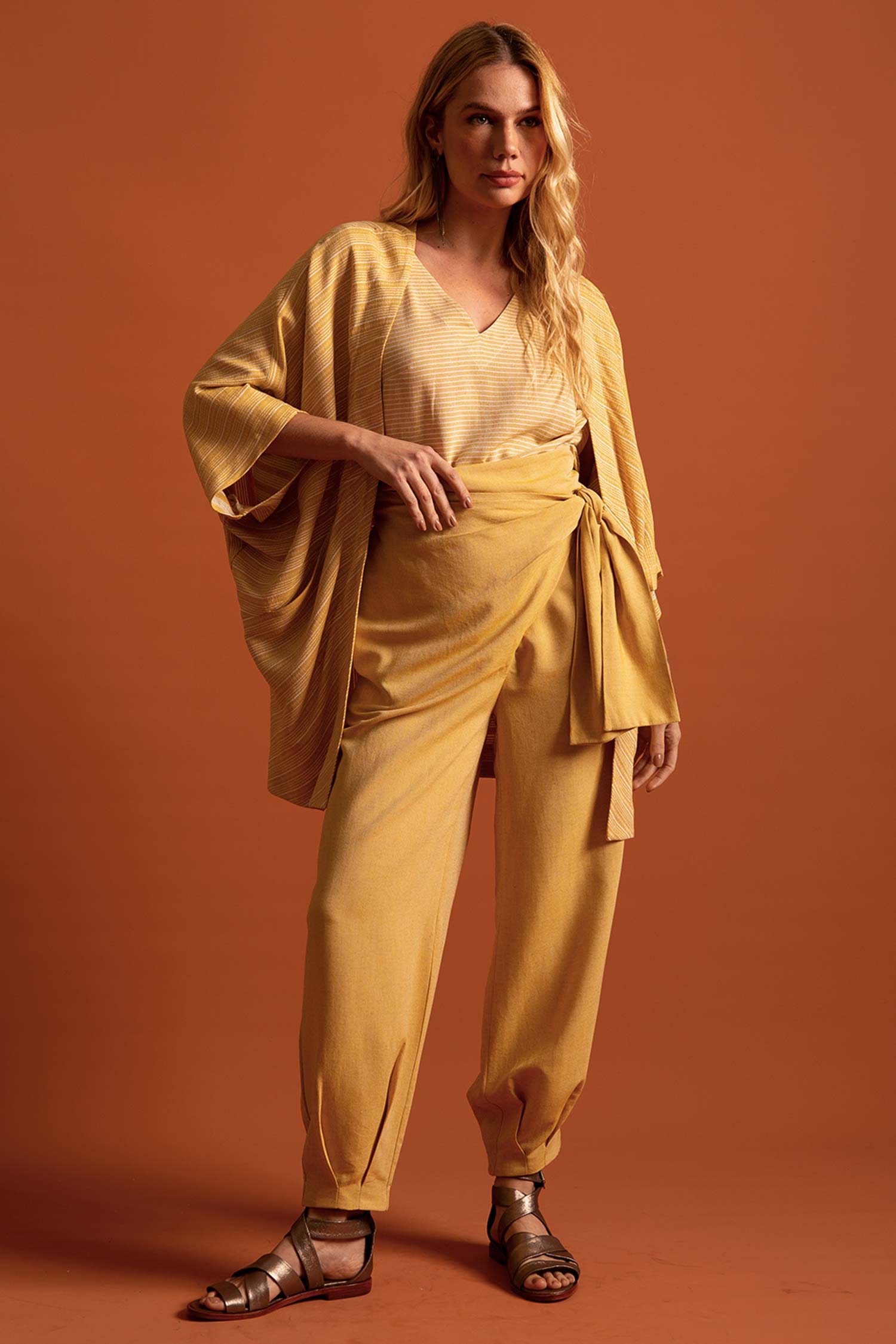A Veste Listrada Índia é confeccionada em tecido leve, garantindo conforto e frescor ao longo do dia.