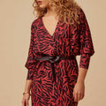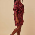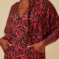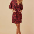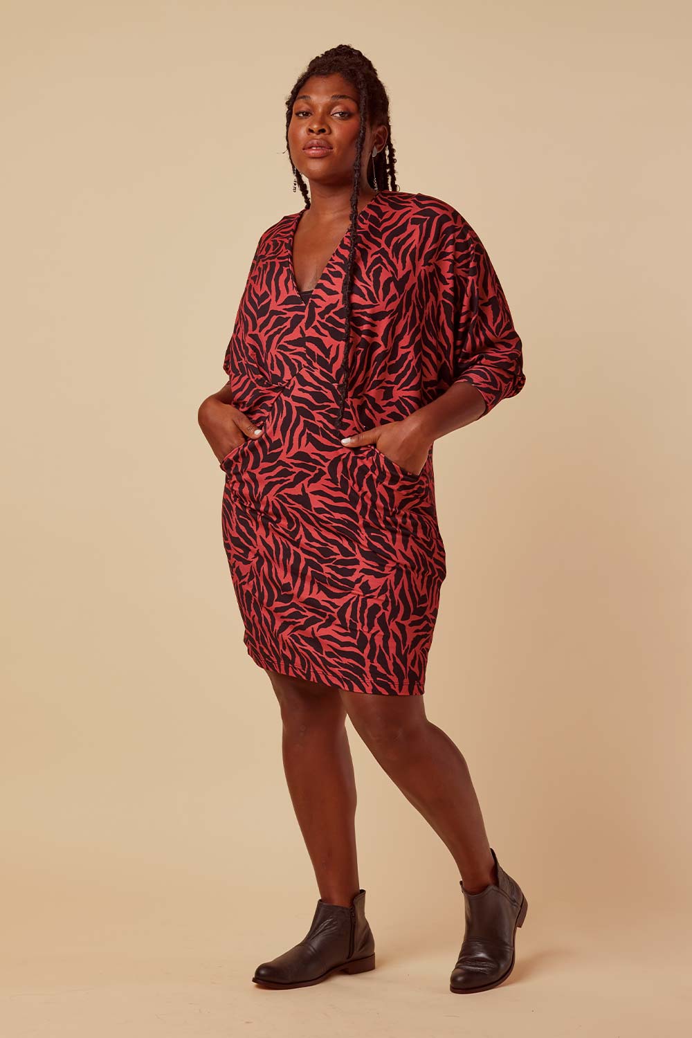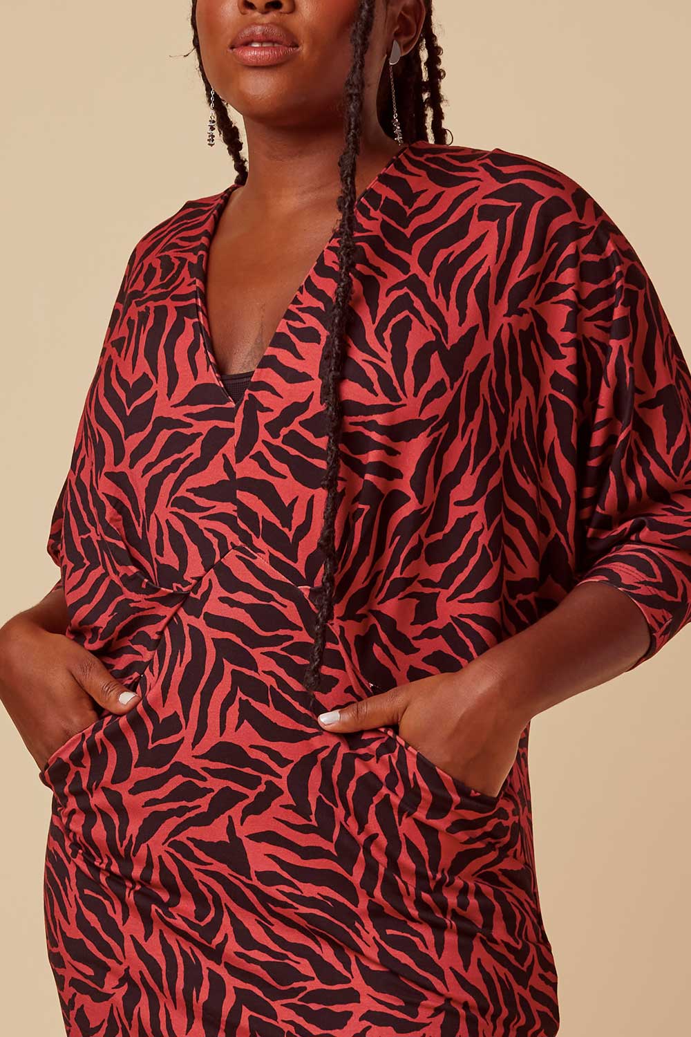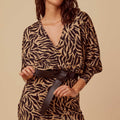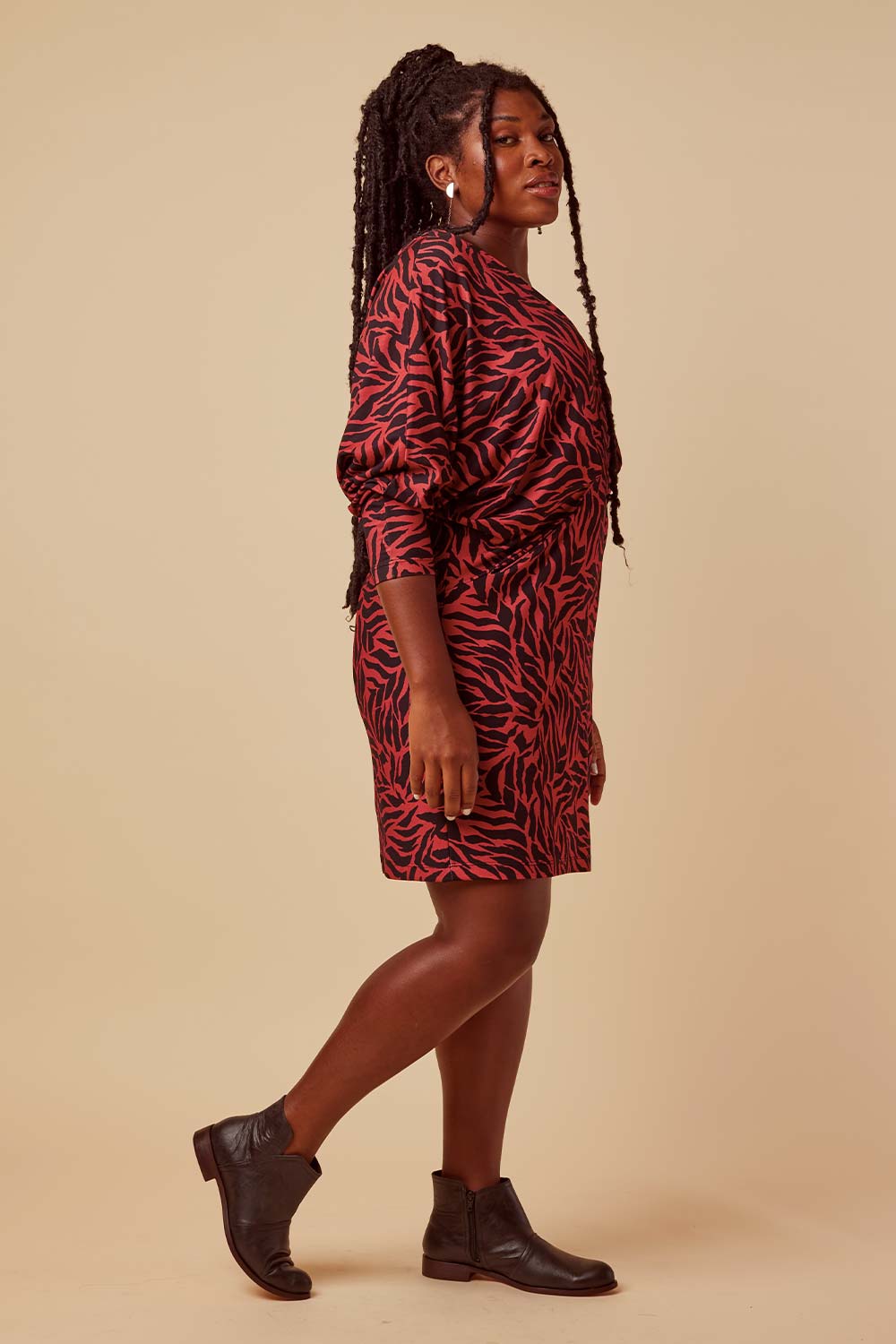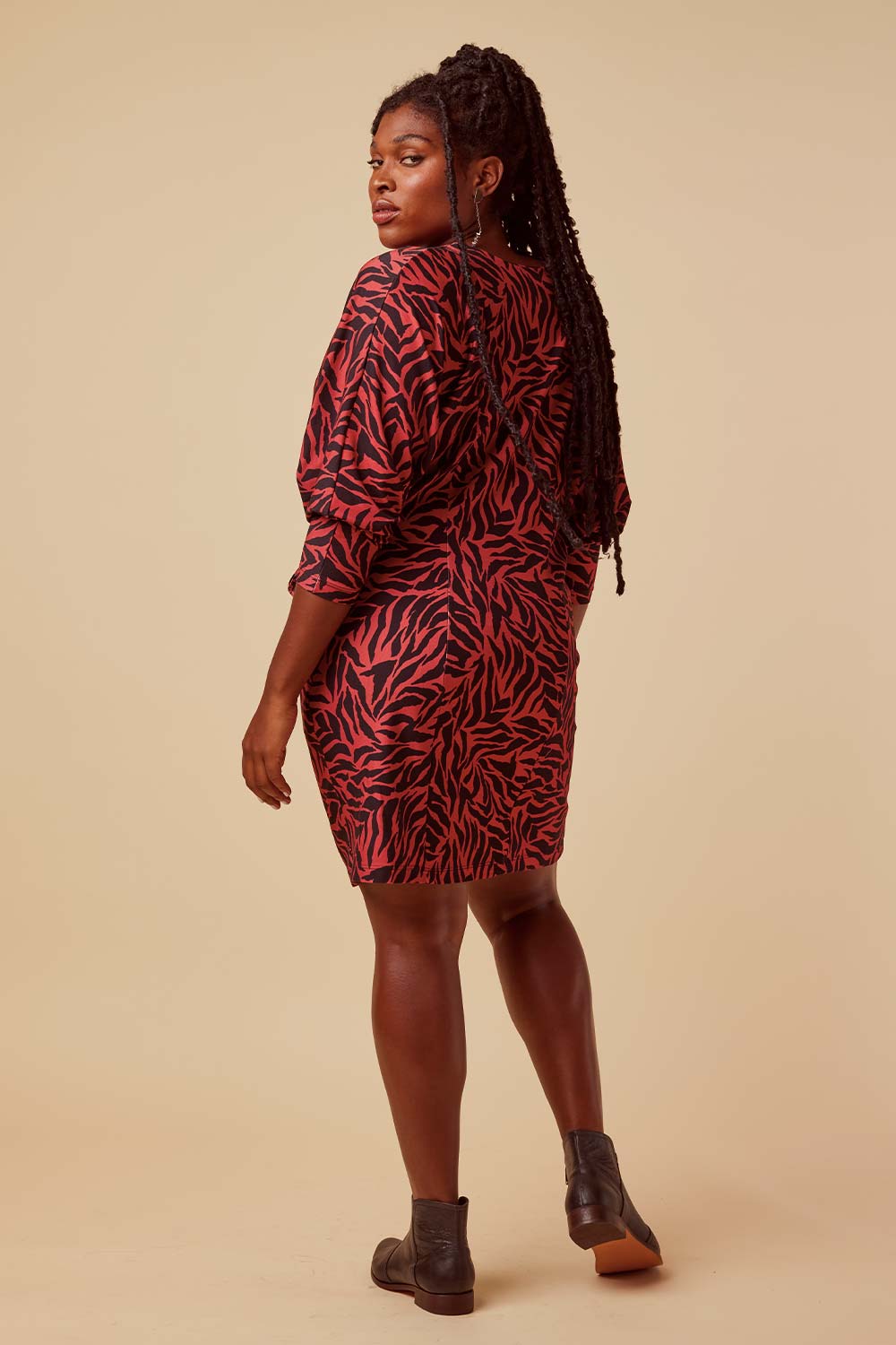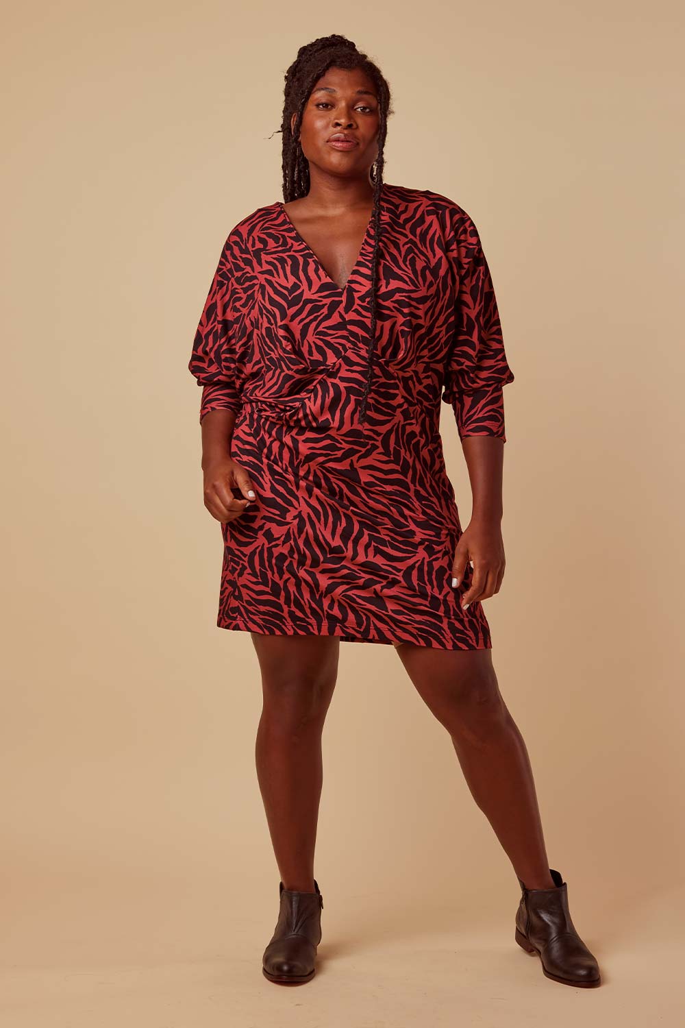 Uma das modelagens que a gente mais ama, agora nessa novíssima versão em animal print. Mini vestido com mangas 7/8, cava morcego e decote V profundo.