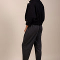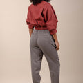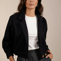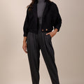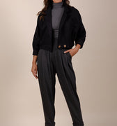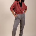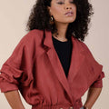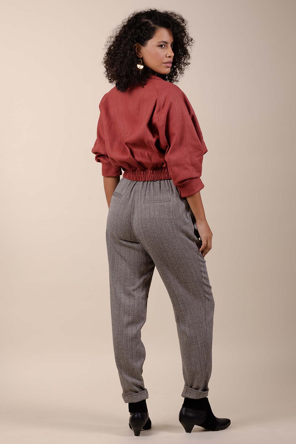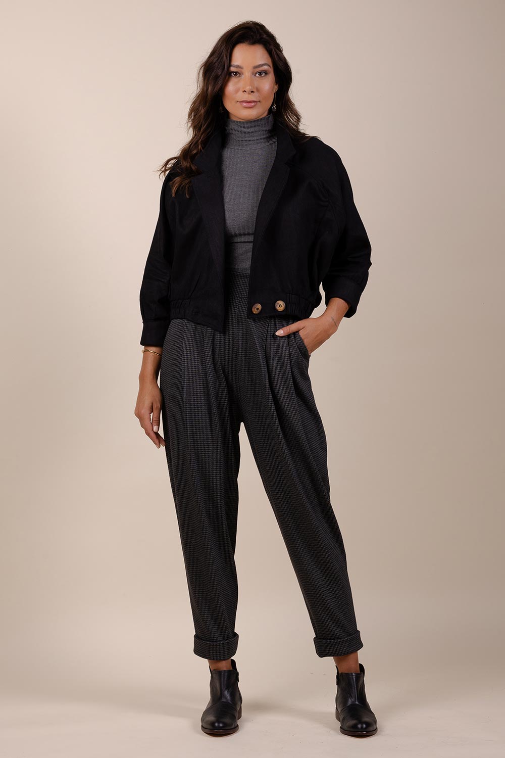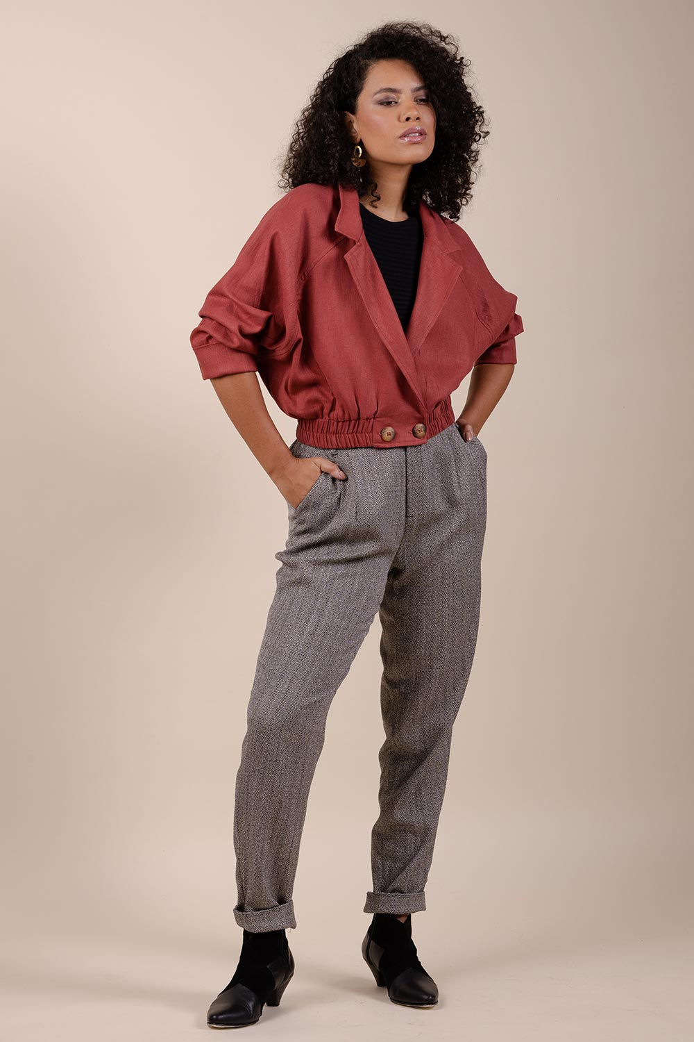 Jaqueta em comprimento curtinho, batendo logo abaixo da cintura, se encontrando com os cós altos de nossas calças. Feita em tecido de rami com algodão, lembrando um linho encorpado. Possui manga 7/8 com punho dobrável, bolsos e elástico na cintura, gola de blazer e  abotoamento transpassado no cós. Um novo conceito de alfaiataria, juntamente com a Calça Pekin forma um terno despojado e moderno.