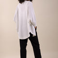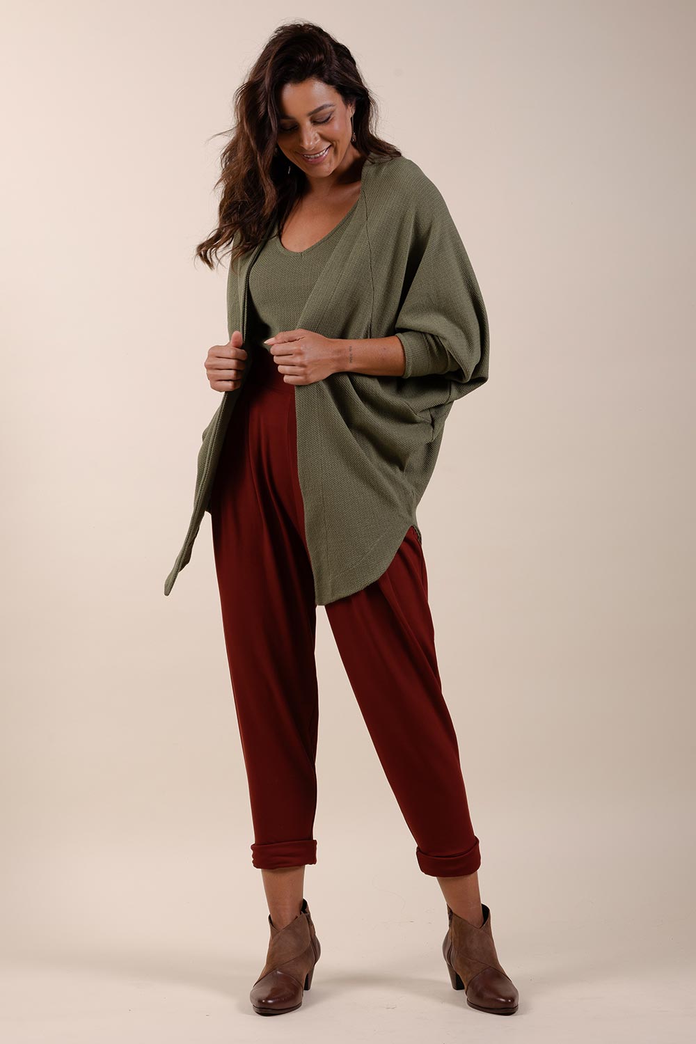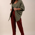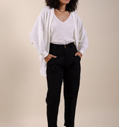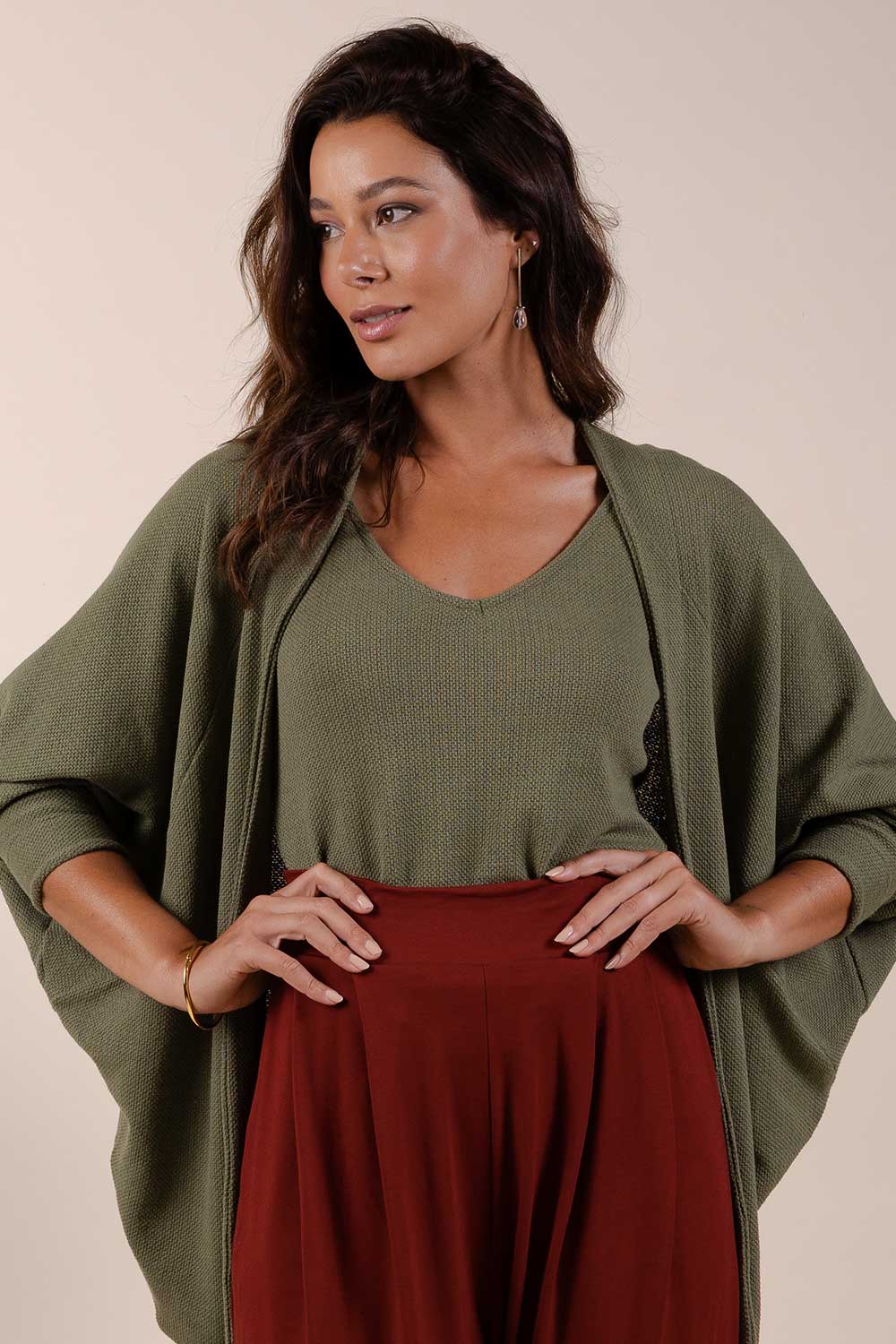 Veste em modelagem oversized, mangas morcego e feita em malha maquinetada tricot. Não possui forro nem abotoamento.