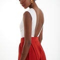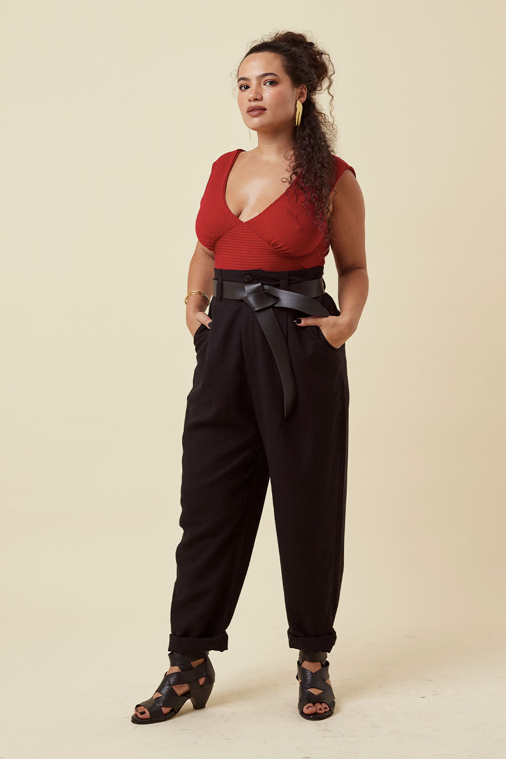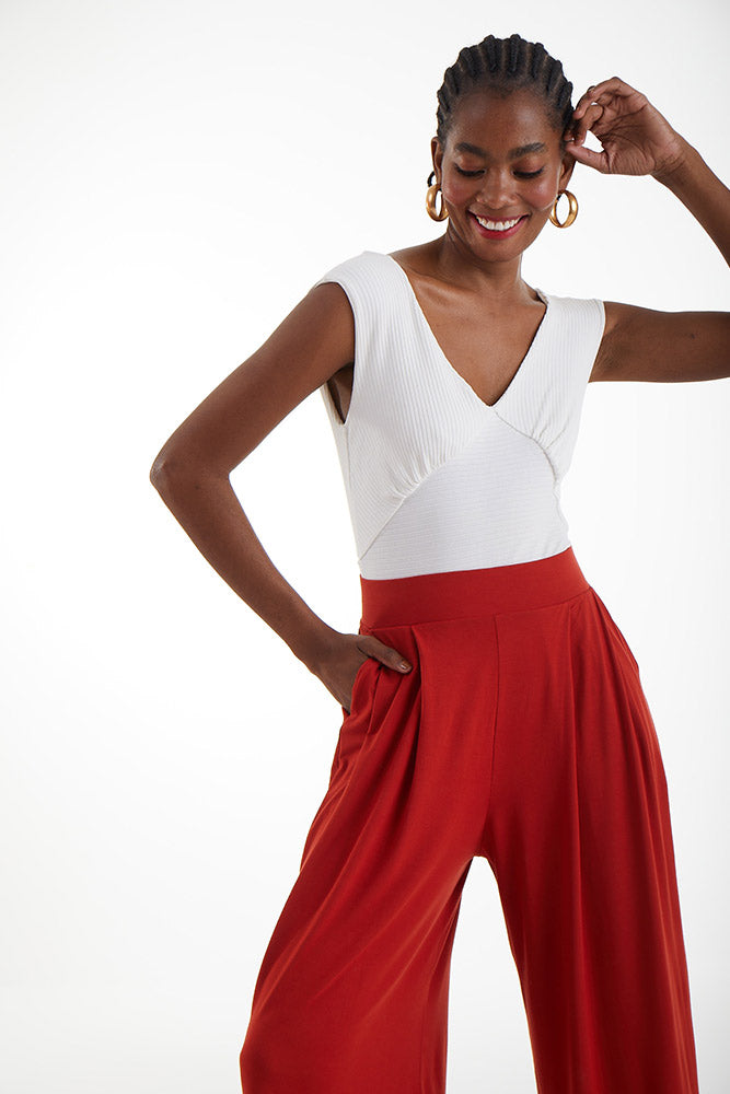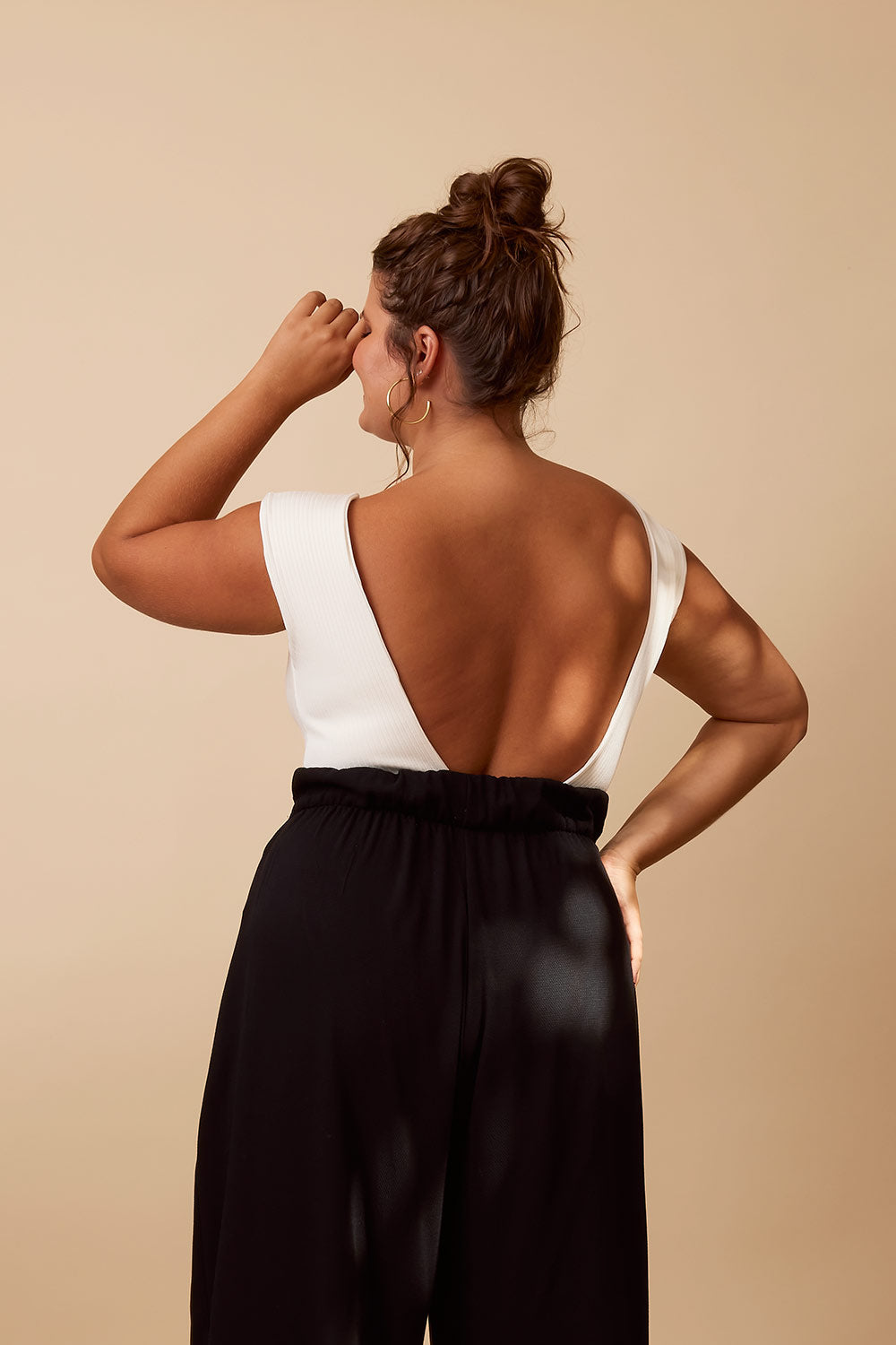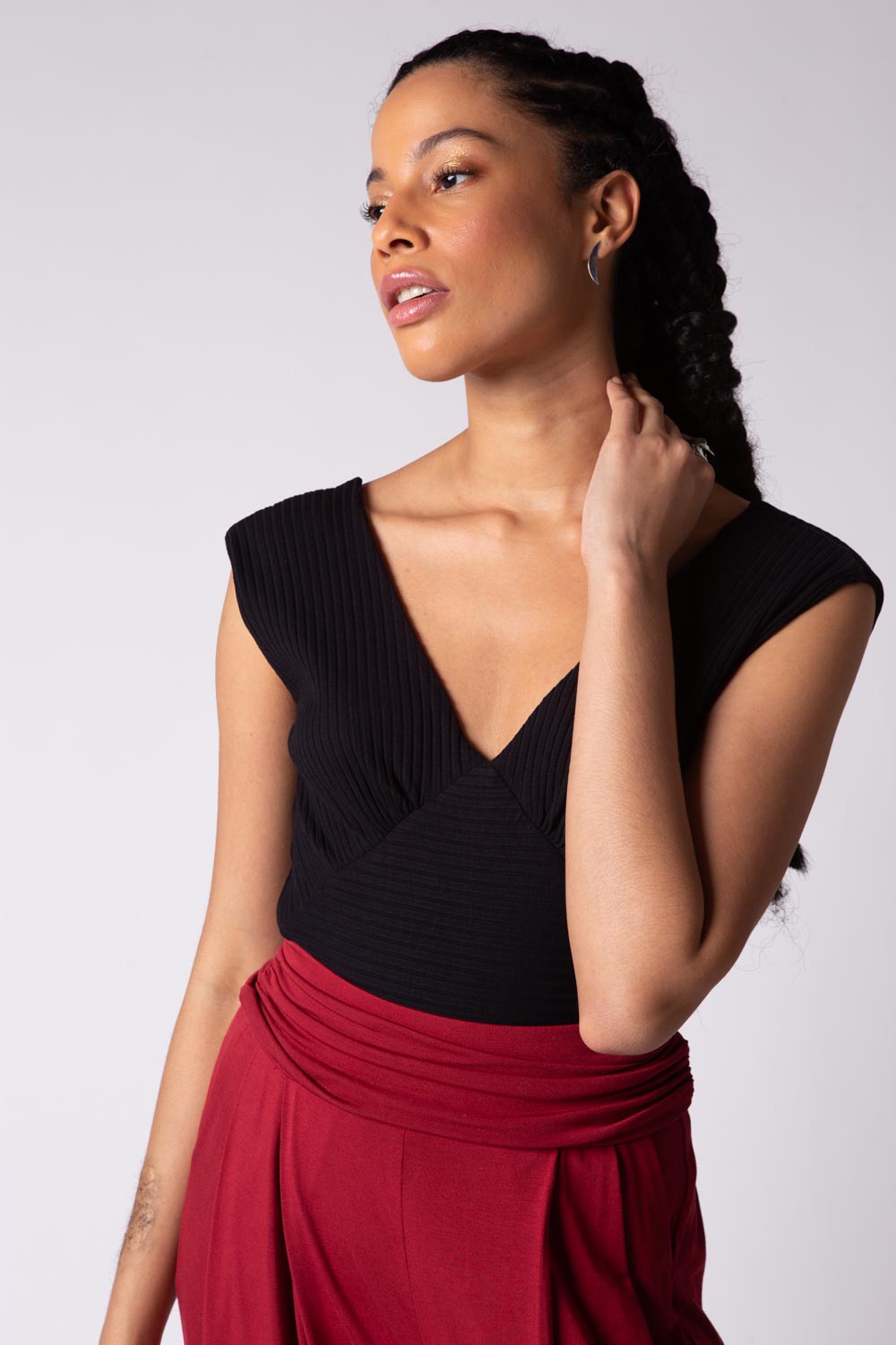 Com decote V na frente e quadrado nas costas, feito em canelado de viscose com elastano. Em tecido macio e resistente, não possui abertura embaixo, veste como maiô.