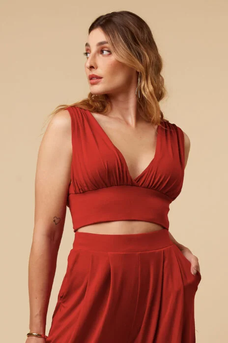 Top cropped com decote V e detalhe drapeado.