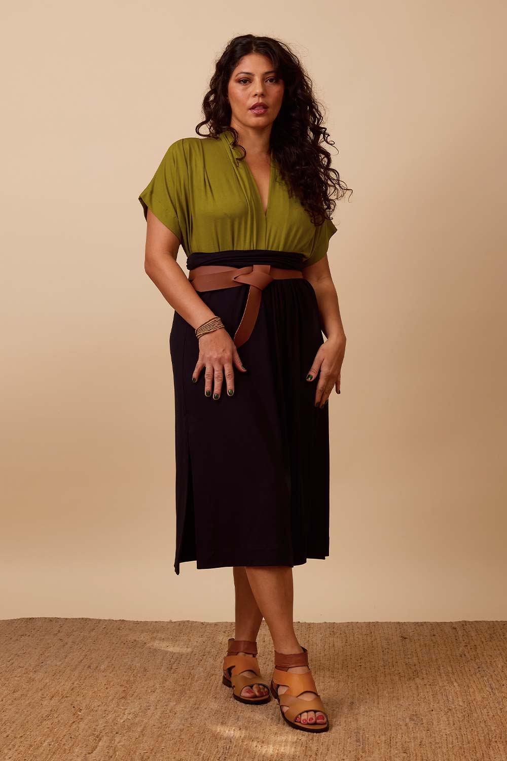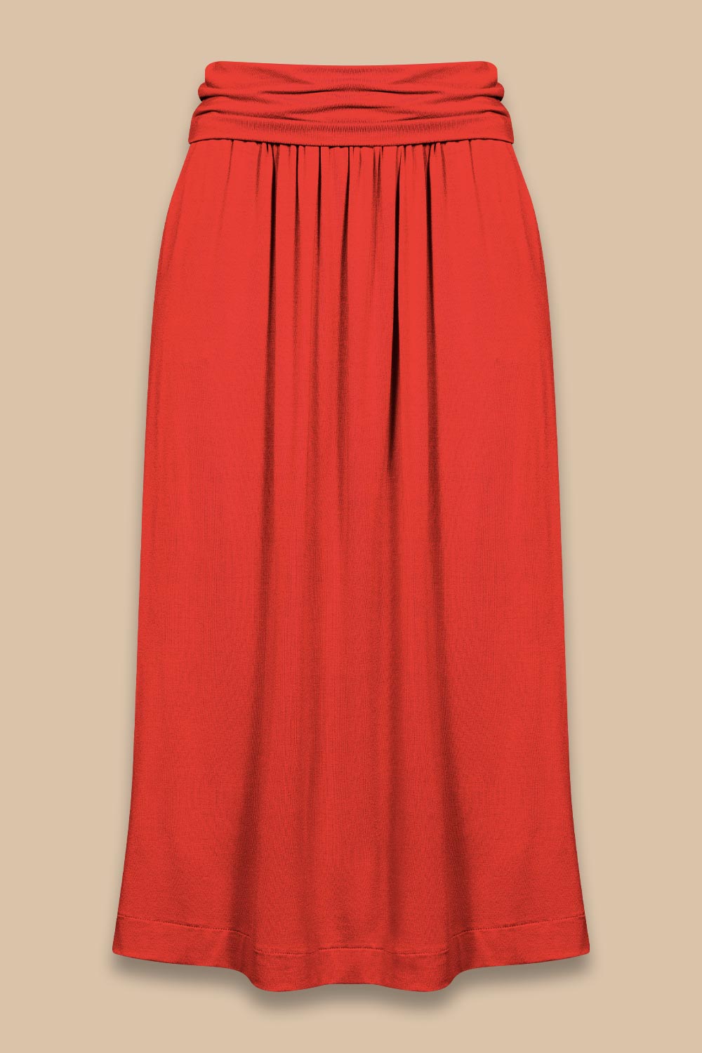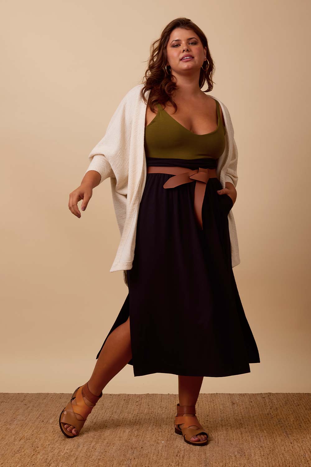 De comprimento midi, com fendas laterais e bolsos, você pode usá-la com a cintura super alta, com cinto como uma clochá, ou ainda dobrando a pala sobre o quadril, deixando-a mais baixa.