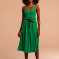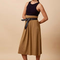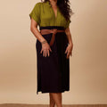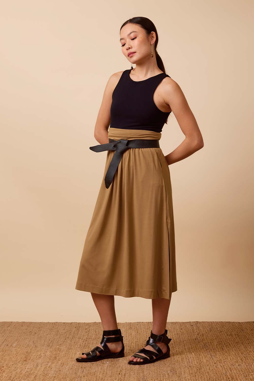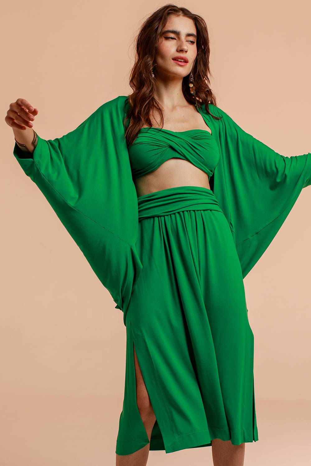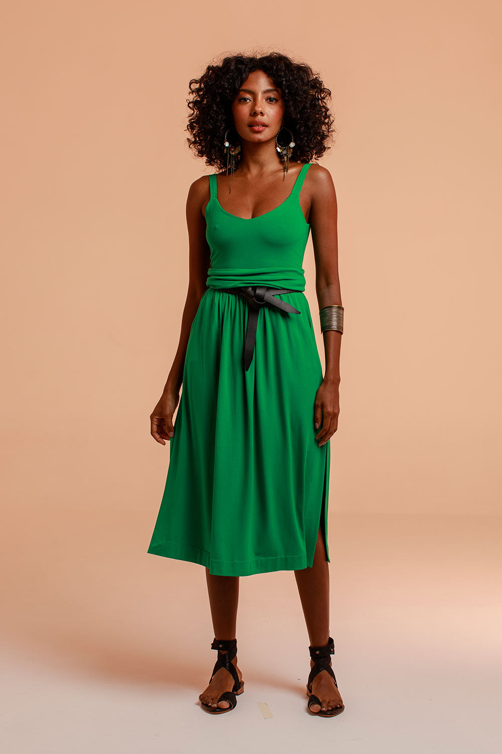 De comprimento midi, com fendas laterais e bolsos, você pode usá-la com a cintura super alta, com cinto como uma clochá, ou ainda dobrando a pala sobre o quadril, deixando-a mais baixa.