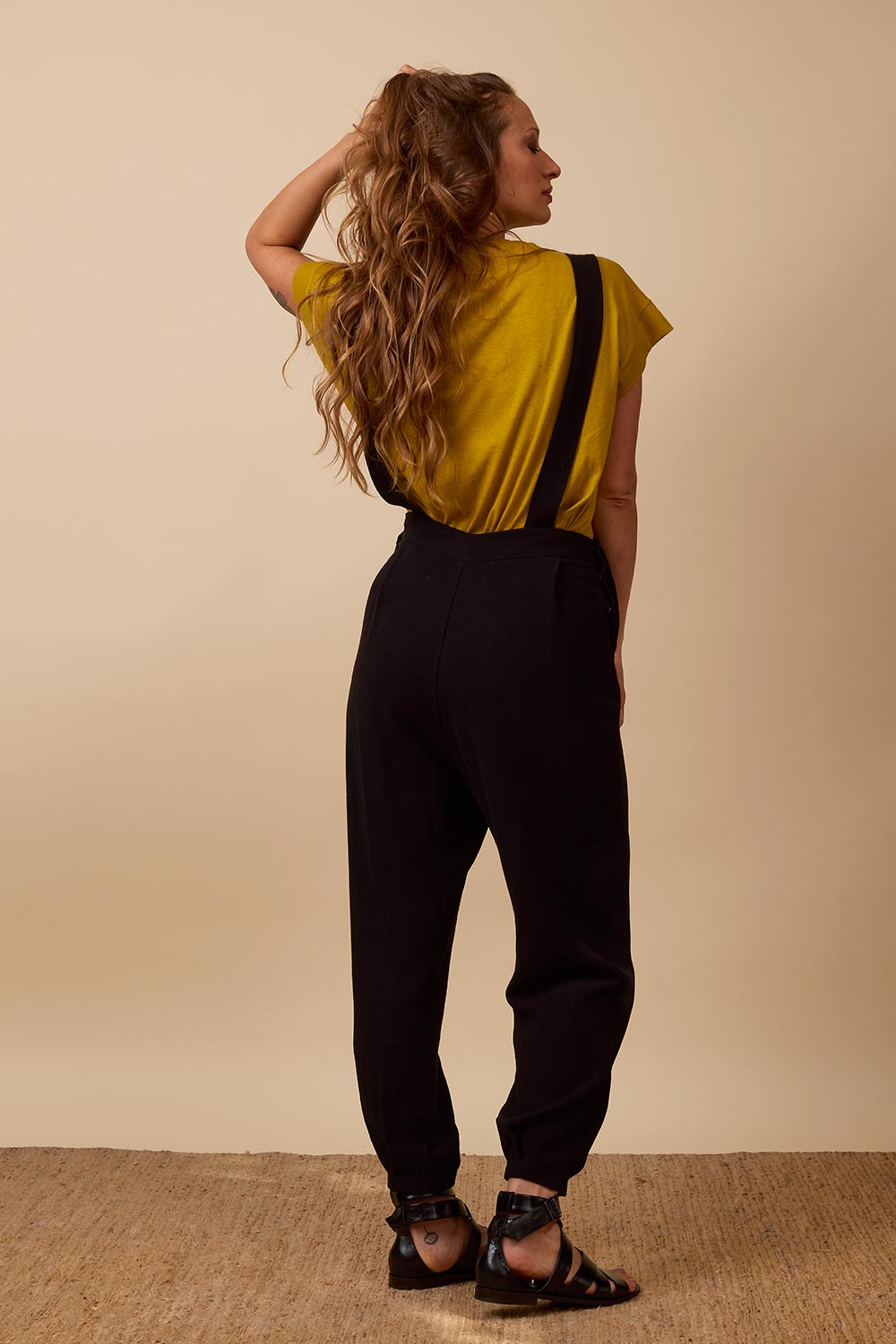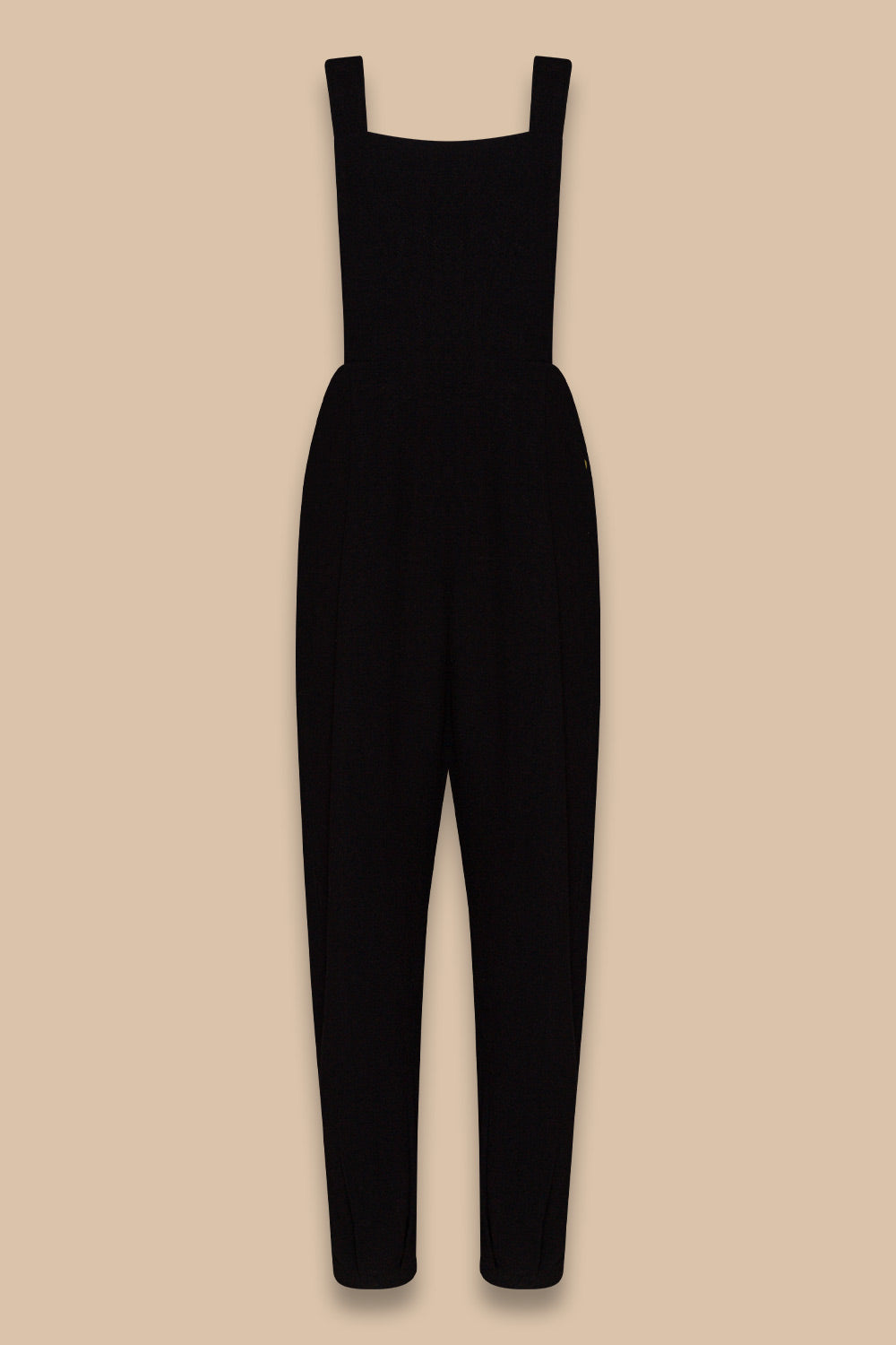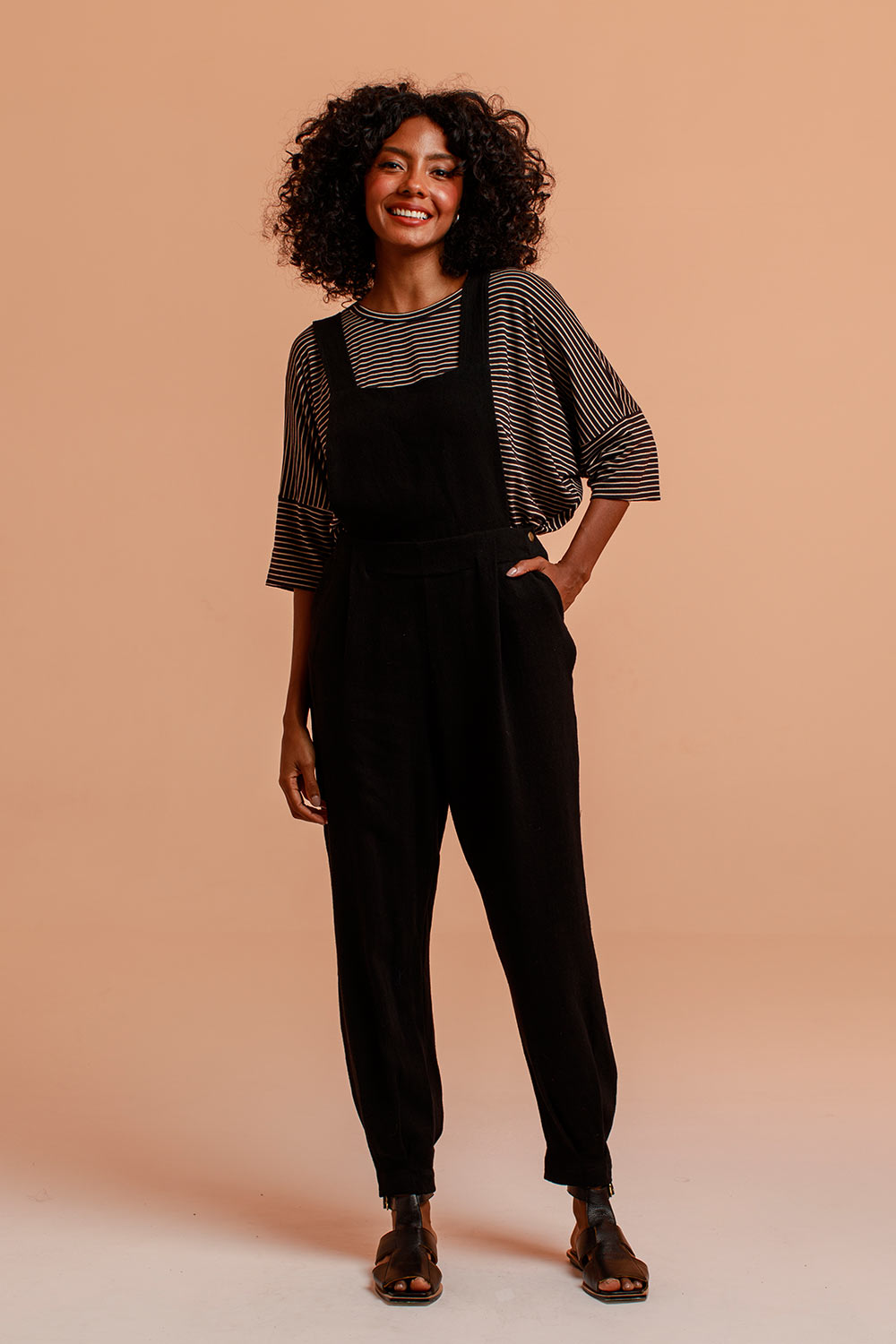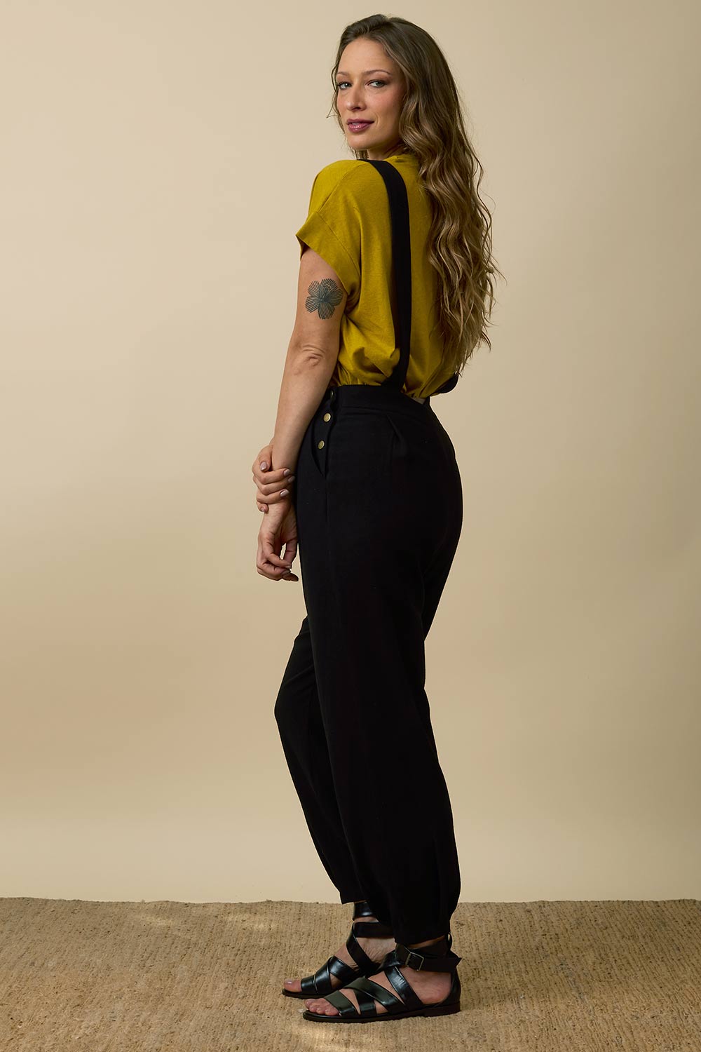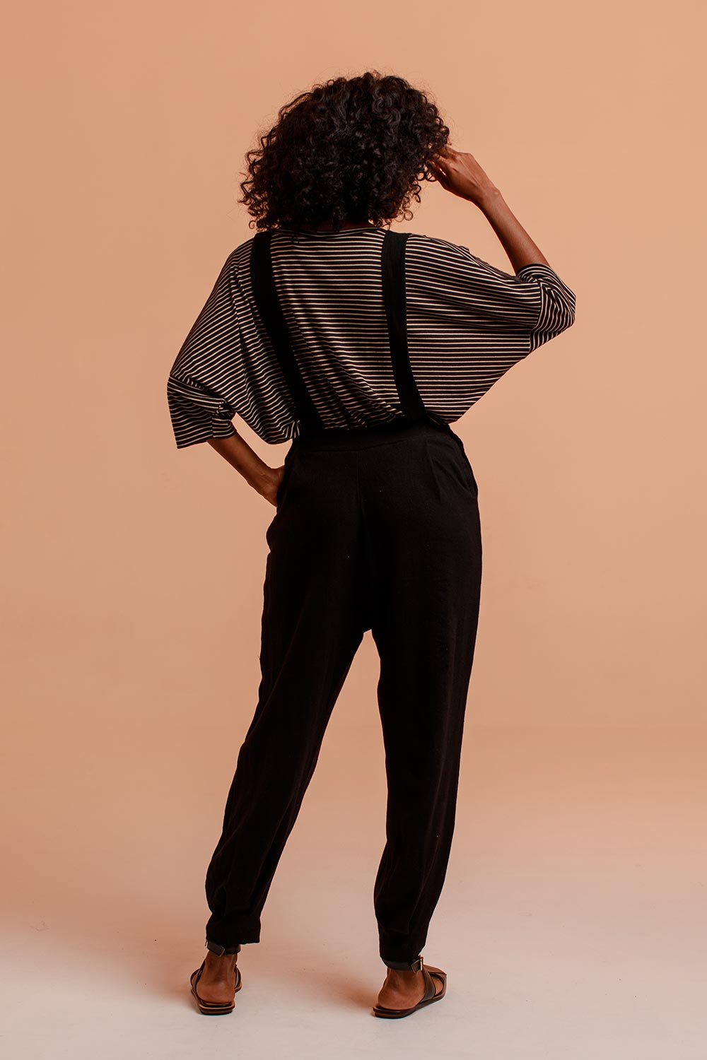 Um jumper com modelagem ampla, com pregas e barra em estilo aladim. Tecido delicioso, com toque macio. Possui alças longas para serem ajustadas conforme necessidade.