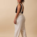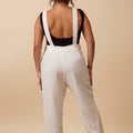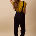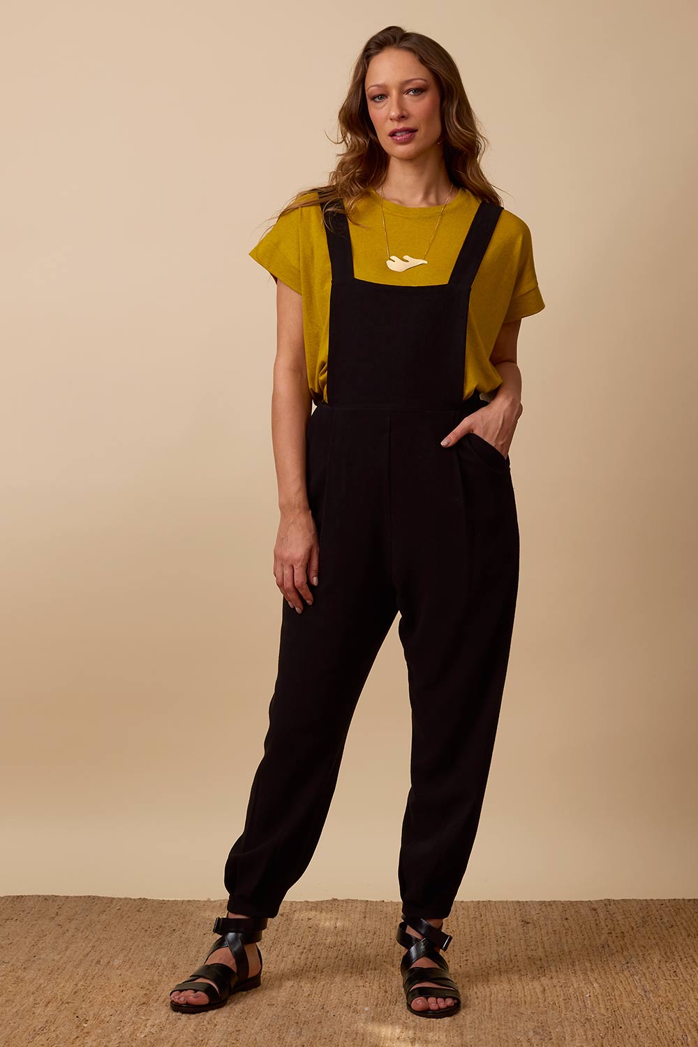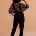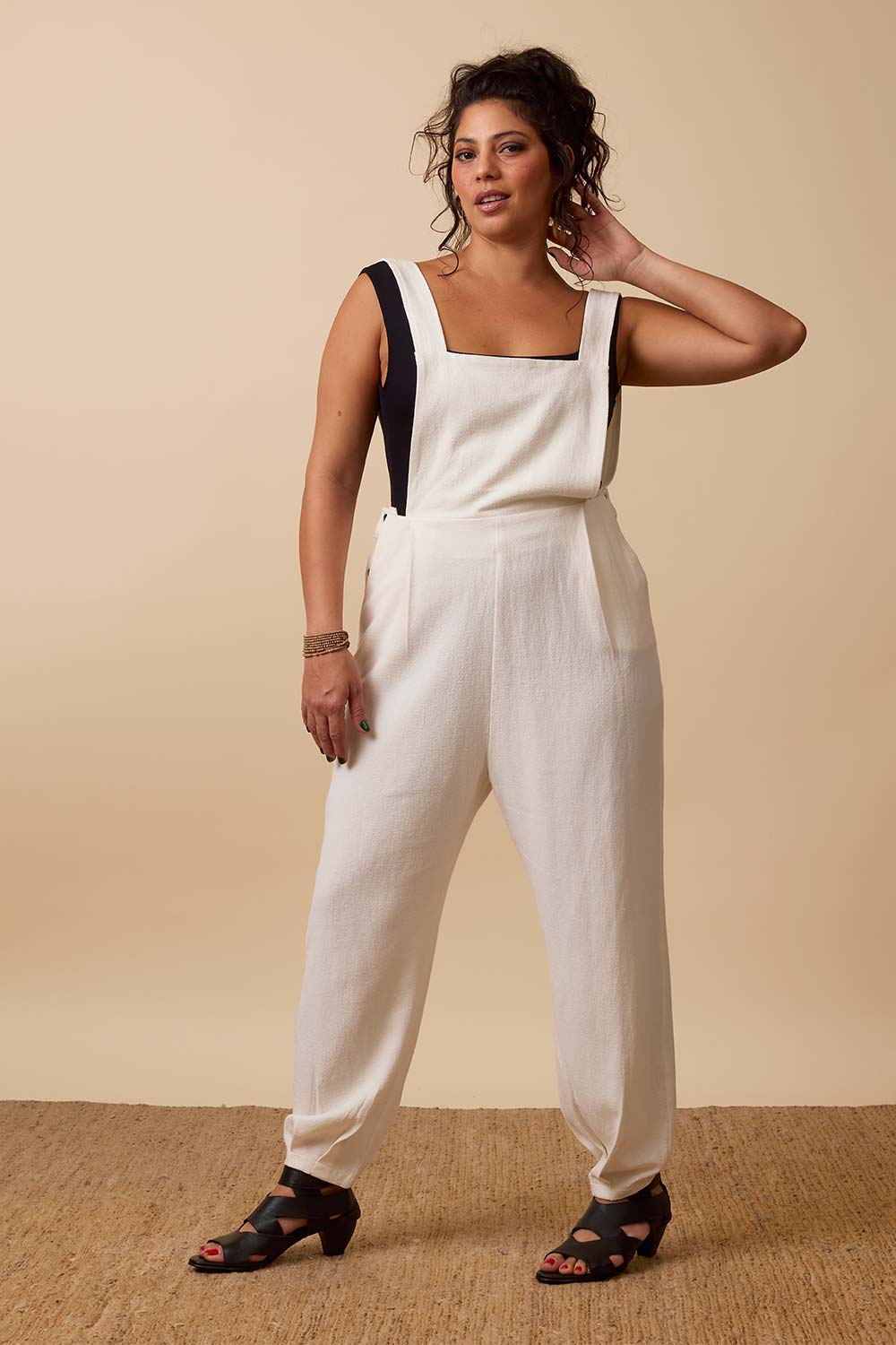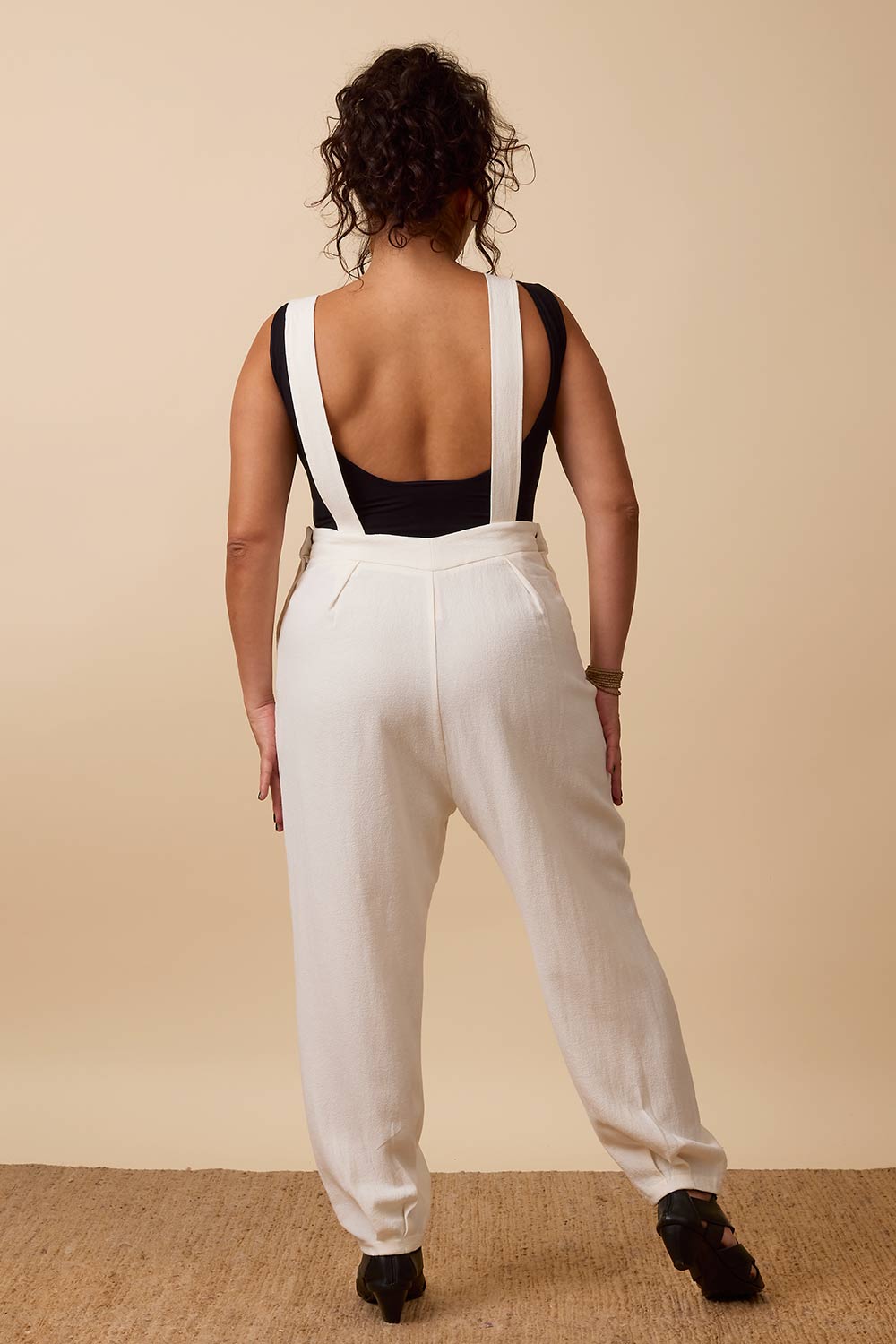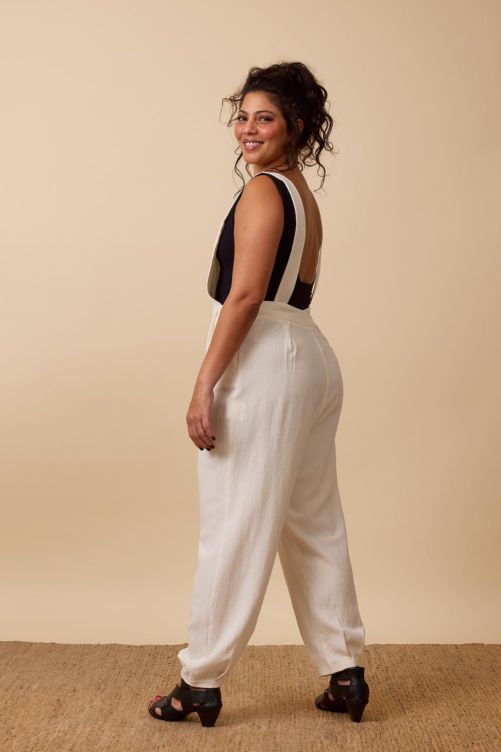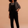 Um jumper com modelagem ampla, com pregas e barra em estilo aladim. Tecido delicioso, com toque macio. Possui alças longas para serem ajustadas conforme necessidade.