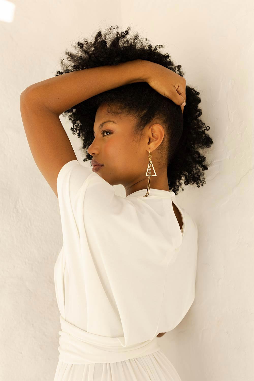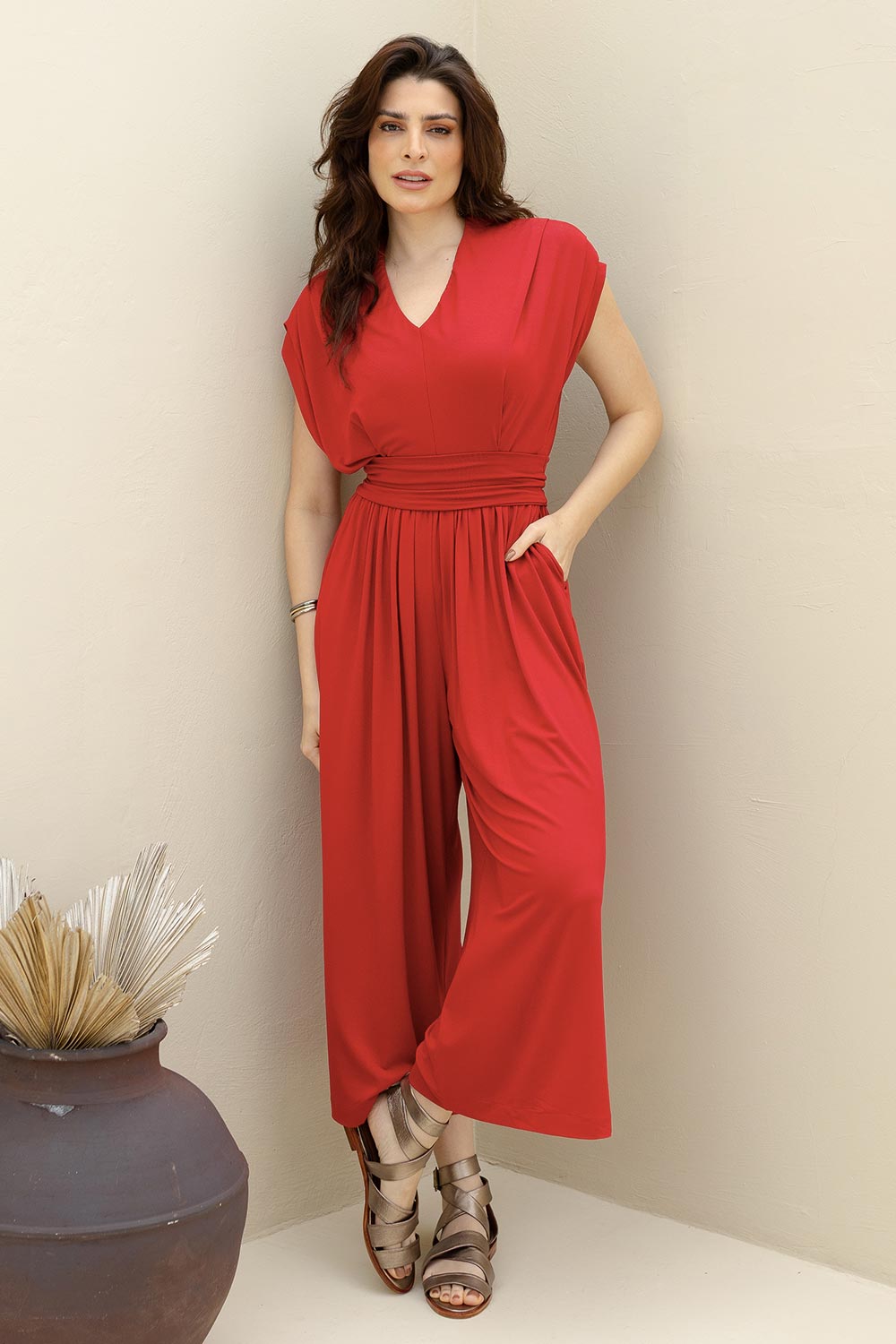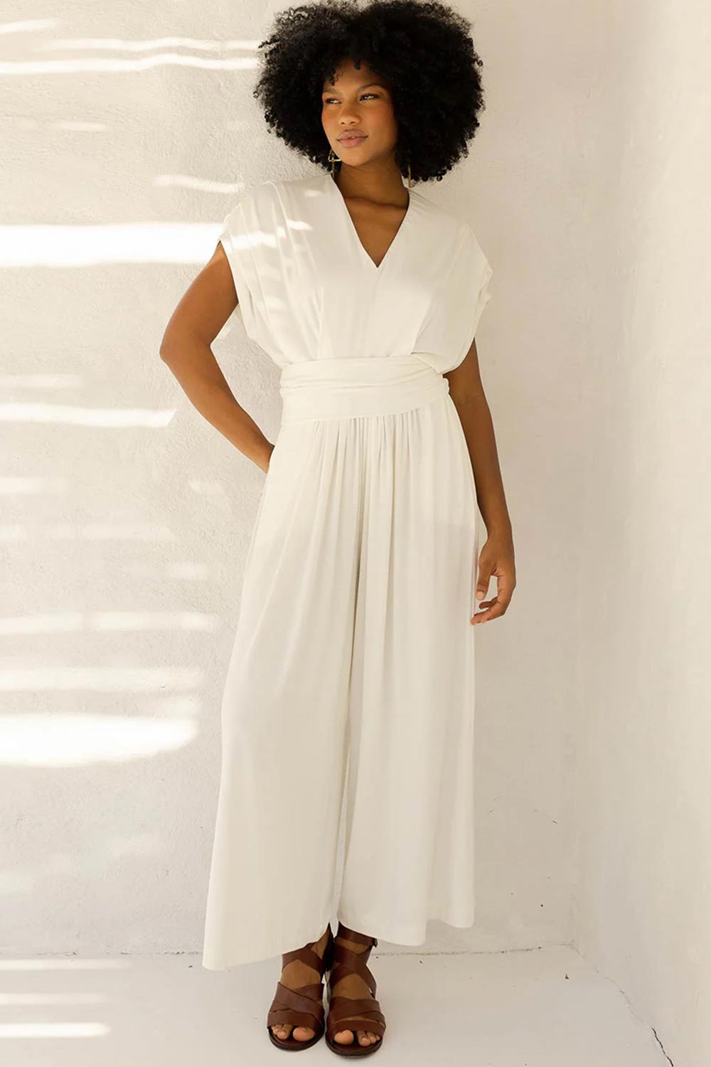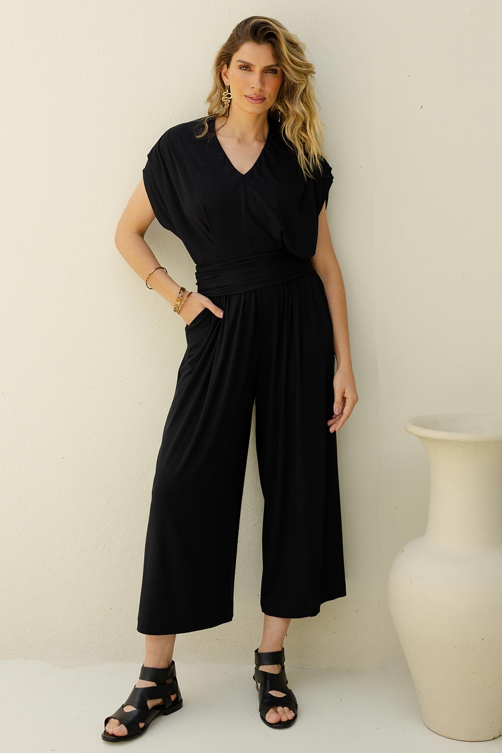 Essa estrutura mais solta dialoga com a parte inferior, onde o macacão se abre em uma pantalona ampla, com pregas que ampliam o movimento e constroem um caimento limpo que alonga a silhueta...